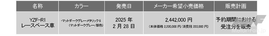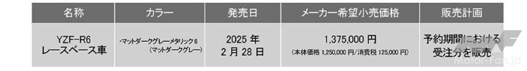 ヤマハ発動機は、「YZF-R1」および「YZF-R6」のレースベース車(2025年型)を発表した。価格は「R1」が税込244万2000円、「R6」が137万5000円となる。発売日は両車ともに2025年2月28日だが、予約受注限定販売となる。予約期間は第一次期間が2024年9月25日(水)〜10月9日(水)、第二次期間が2024年10月10日(木)〜11月29日(金)となる。レースベース車は、通常のモデルからヘッドランプ、ミラー、タンデム装備といった公道走行および車検通過に必要な装備を除いた車両となる。