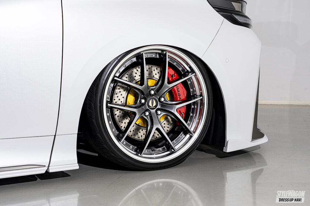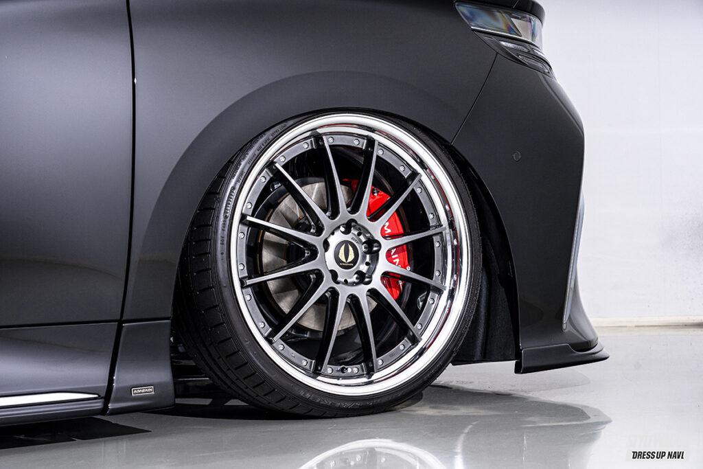 高級車であり憧れの的でもある40系アルファード&ヴェルファイアには、奇をてらった独創デザインもアリはアリだが、やはり上質感を漂わせた王道デザインホイールが良く似合う。しっかりと個性は主張するけれど決してやり過ぎ感のない意匠で、その分、攻めたサイズマッチングでLクラスに相応しいオーラや緊張感を演出するというコーディネイト。出自が上位な40だからこそのコーデ術だ。