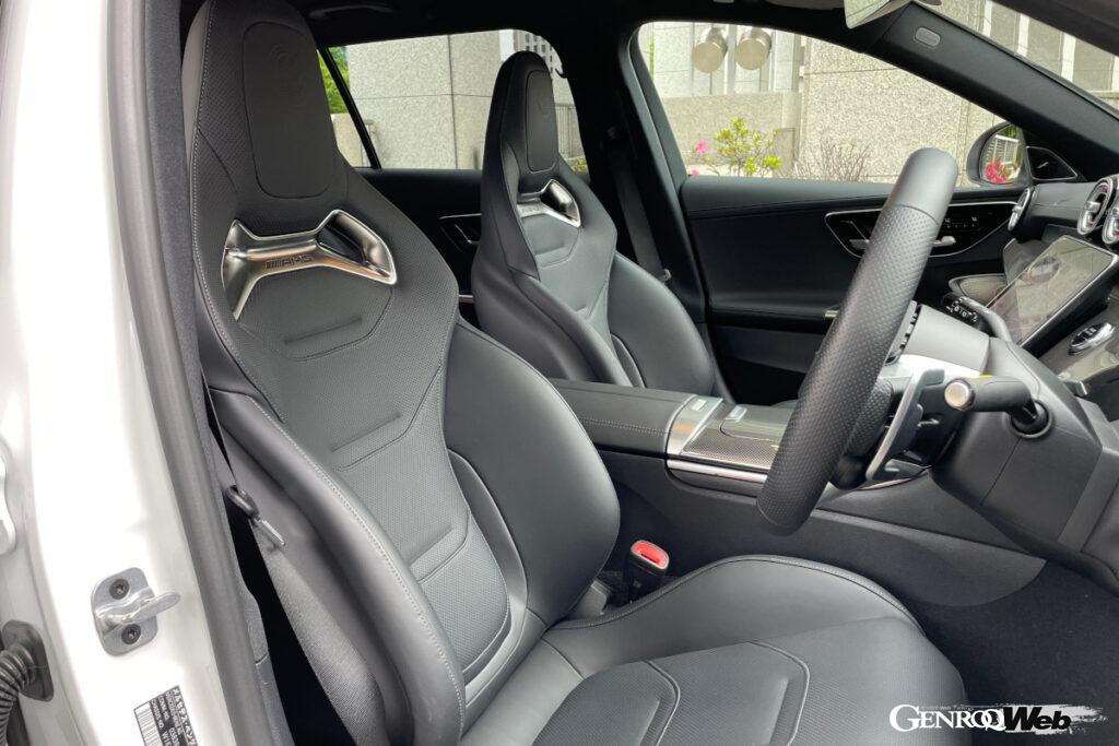 スポーティなバケット型シートはAMGパフォーマンスパッケージ(導入仕様モデルに標準装備)に含まれる新デザインのAMGパフォーマンスシートを装備していた。サイドサポートが深く、ホールド感は抜群で、サーキット走行もこなせそうだ。一方で座面高が意外と高いので「63」のようなモデルなら、もう1〜2cm下がってもいいのではないかと思った。