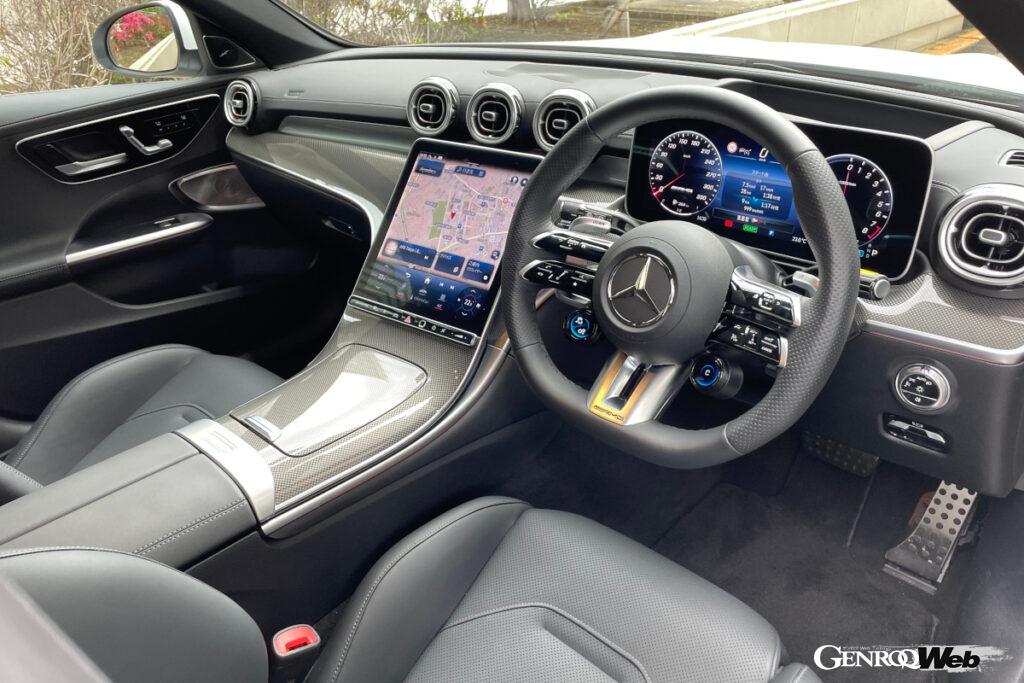 ステアリングのロックトゥロックは2回転未満とクイック。操舵感は軽めで好ましいが、右ハンドルの足元が意外と狭いことと、ステアリングの握りが太いのが気になった。リヤアクスルステアも装備しているが、最小回転半径は5.9m(C200は5.2m)で大きめだ。駐車場の取り回しはしんどいかもしれない。走行中は100km/h以下で前輪とは逆相に最大2.5度舵がきれる。高速走行時は前述のAMGダイナミックセレクトのモードによって最大0.7度同相にきることで後輪の安定性を高めるという。