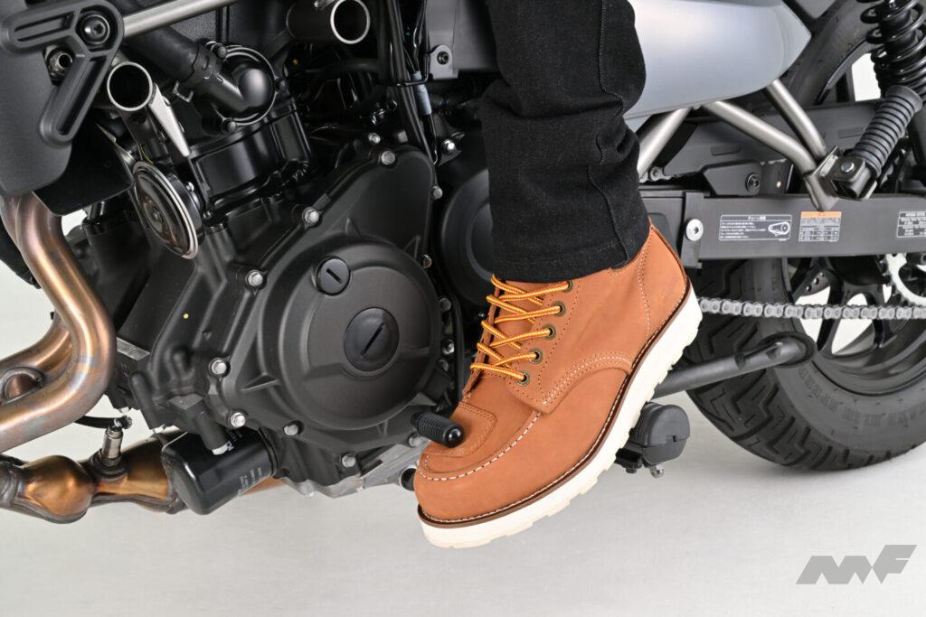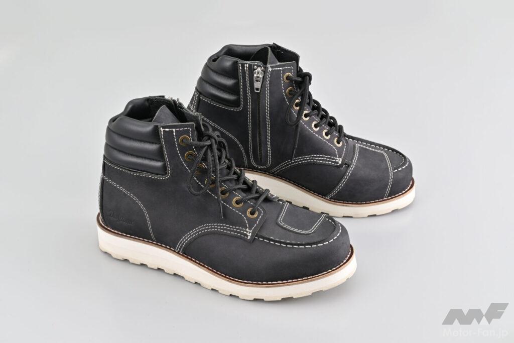 バイクを降りてからでも動きやすい、カジュアルに履ける本格モックトゥブーツ。マット調で厚みのある牛本革を使用しているため、長く履き続ければ経年変化による風合いを楽しむこともできる。つま先にはシフトパッドも装備して、ブーツの痛みも軽減してくれる。足首にはシャーリングを配置していることで、ブーツでありながら動きやすく、長距離を歩いても疲れることがない。ソールにはEVA+ラバーのフラットソールを採用し、滑りにくく車種を問わず乗りやすい設計とした。安全性と機能性を両立したライディングシューズだ。