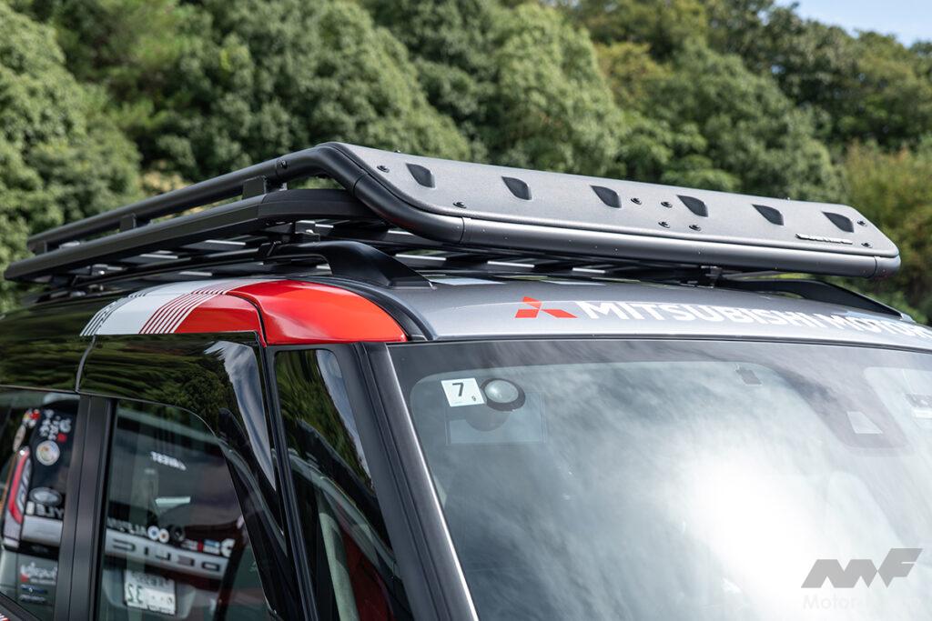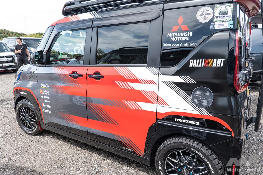 ディスプレイ業を営む池ちゃんさんはオートクルーズ機能のあるこのデリカミニが大のお気に入り。カスタムコンセプトはズバリ、2022年の三菱トライトンのラリーアート。純正のチタニウムグレーメタリックのボディに、黒×白×赤の三菱カラーを使用。作業はラッピング業を営む友人に手伝ってもらいつつ、会社の倉庫で少しずつ施工。この世界観を見事に再現した。外観はオートフラッグスのフロントガードに、ランドリックのグリルマーカー、バスターズミニのルーフラックで雰囲気満点の仕上がり。室内はシートカバーにハセプロ、アルパインのオーディオ類。今後はリフトアップも視野に入れているとのことだ。