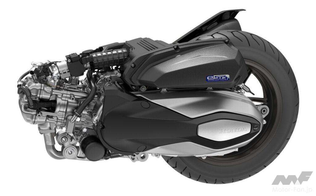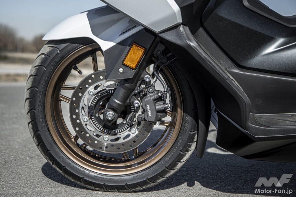 ホイール径およびタイヤサイズは奇しくもXMAXと共通で、フロントは120/70-15、リヤは140/70-14を採用する。フロント13インチ/リヤ12インチだった第1世代から知る身としては、この20年あまりでずいぶんと大径化が進んだものだと感慨深い。