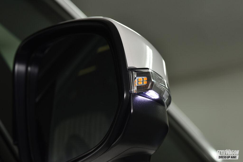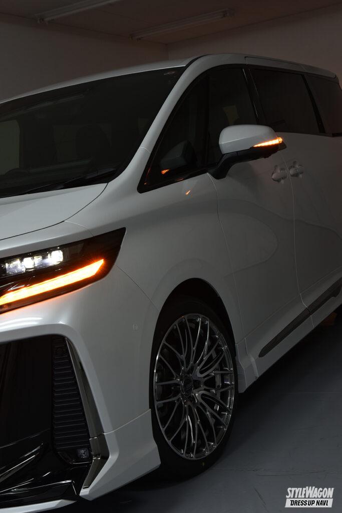 純正ミラーウインカーレンズと比較して、ウインカー発光部分が大きいヴァーティカルアローは存在感も抜群。ドレスアップにおいてお馴染みとなっているシーケンシャルウインカー機能や、スモールライト連動で光るオプションランプを内蔵。さらに乗り降りをサポートしてくれるフットランプといった多彩な機能を搭載していることもポイント。また、製品にも冠するアロー(弓矢の矢)をデザインモチーフとした立体的な内部構造を盛り込んだウインカーレンズ部分にも注目。