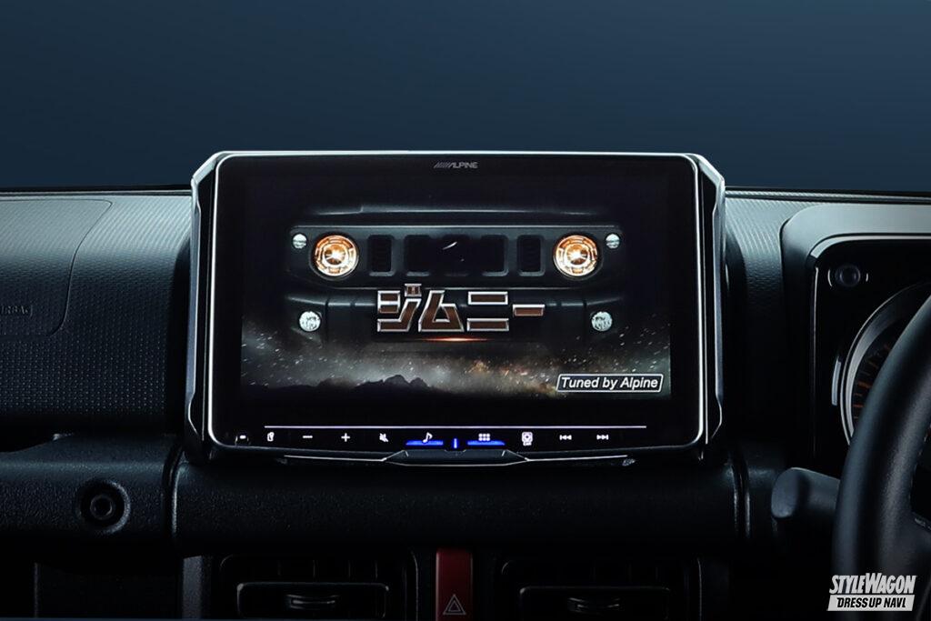 ジムニー&シエラの純正には、ナビは7機種あるが、DAの設定がない。そこでアルパインは、「ナビはスマホアプリでOK」というユーザーに向け、9型のDAをラインアップ。既存のフローティングDAの場合は構造上、上方と手前に少し出るインストールとなるが、ジムニー専用を突き詰め、上にも前にも全く出ないパーフェクトフィットシリーズとして登場した。ジムニーらしいラギッドデザインを意識した専用パネル内にぴったりとフィットしたパーフェクトビッグDAは見やすくシンプル。AppleCarplay(ワイヤレス対応)とAndroidAutoに対応し、音楽、地図、メッセージなどのスマホアプリを大画面で利用できる。オープニングにはジムニー/シエラのイラストも表示される。また既存の9型DA(DAF9Z)を同様に取り付けるためのリプレイスキットも販売。