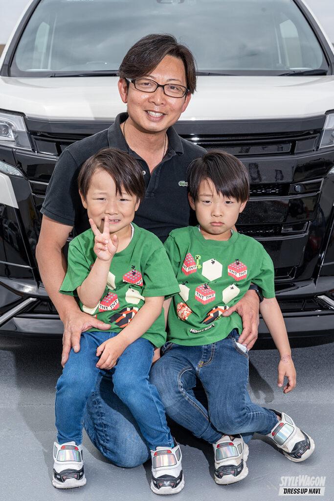 お子さん2人と一緒にイベント参加してくれたシーサーさん。愛車のポイントはフロントグリルとスポイラー。エムズスピード+モデリスタ加工取り付けで他の誰とも違うスタイルを確立。塗り分けの仕方でさらなる個性も主張。