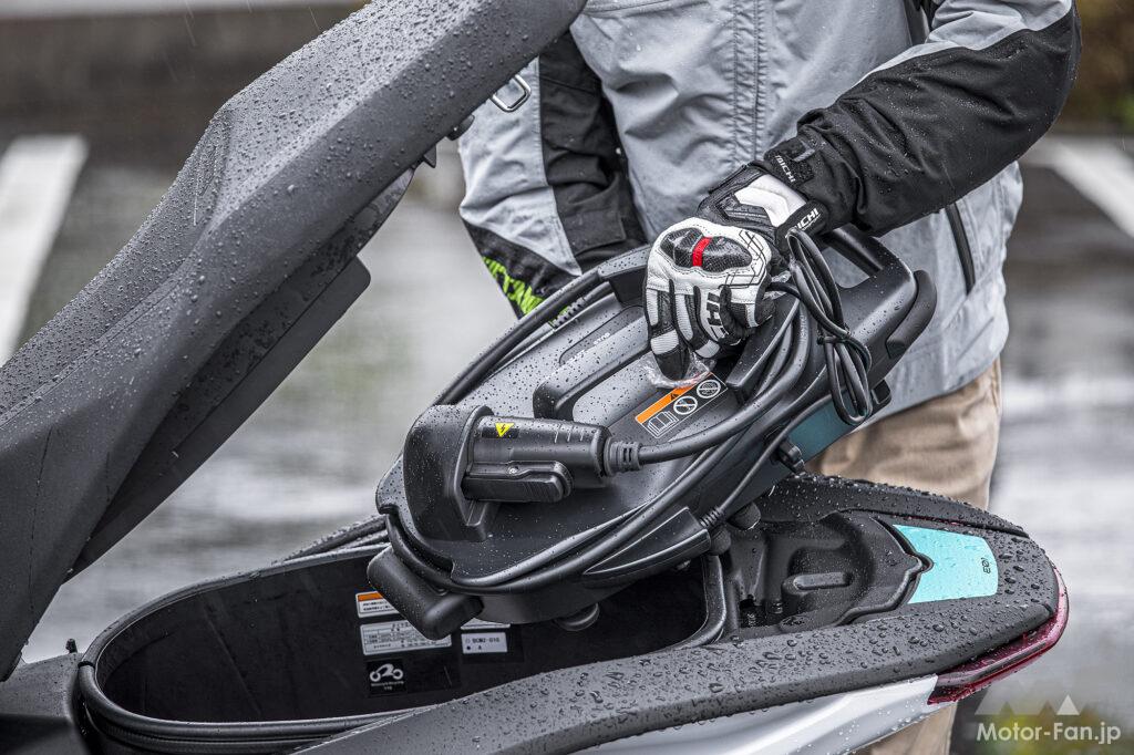 PHEVやBEVの普及で家庭用充電器を設備済みケースも珍しくはなくなってきているが、現状ではそれをE01に利用することはできない。またE01用充電器が、今後近い将来に登場するEVスクーターで活用できる保証もないのが現状なのである。