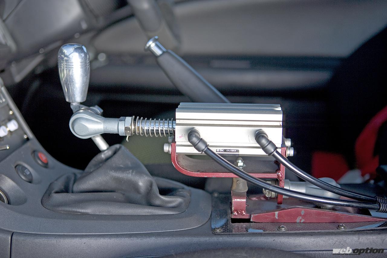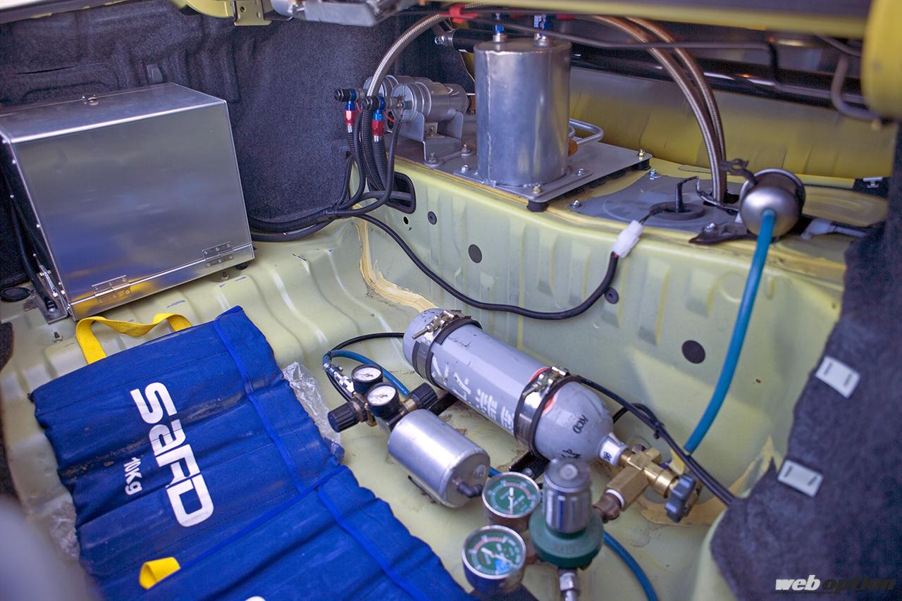 ミッションはホリンジャーの6速シーケンシャルで、工業用の窒素ガスとエアシリンダーを組み合わせたオリジナルのエアシフターをドッキング。このシステムの採用で、シフトミスが無くなり一気にタイムアップしたそうだ。