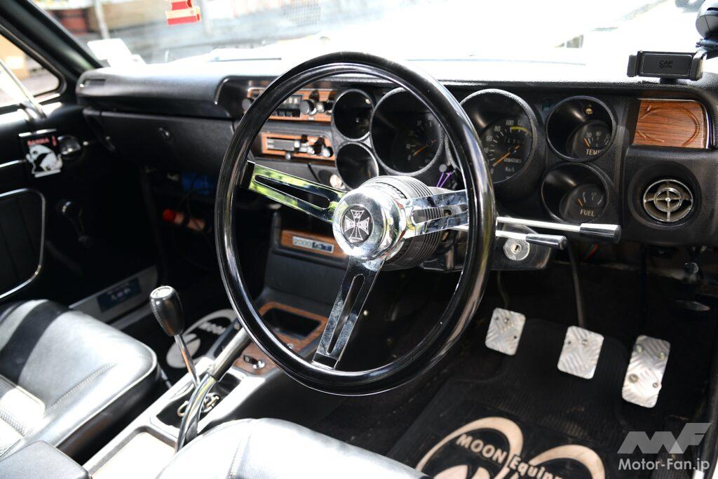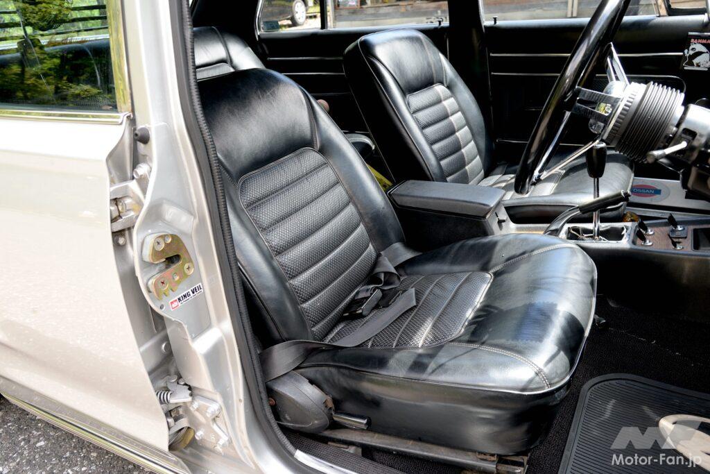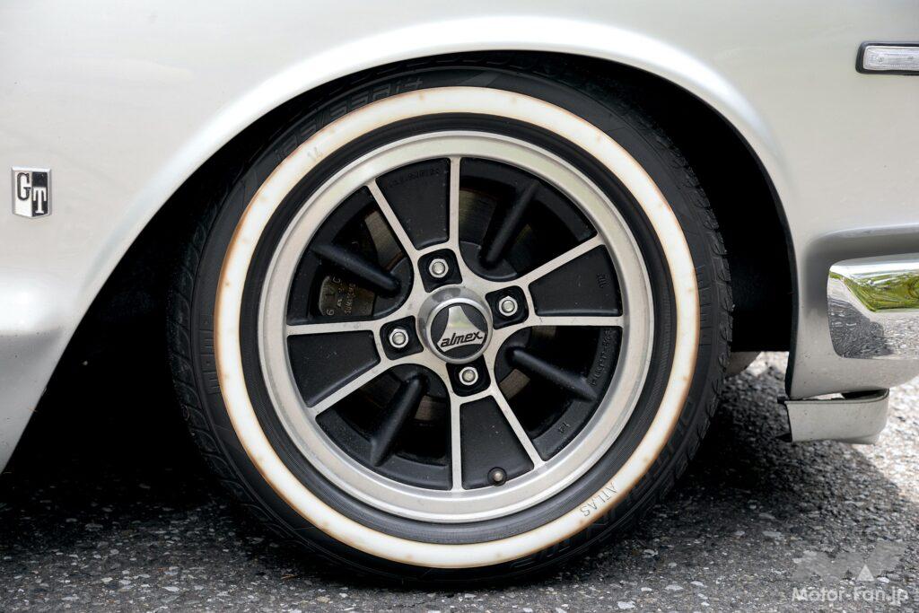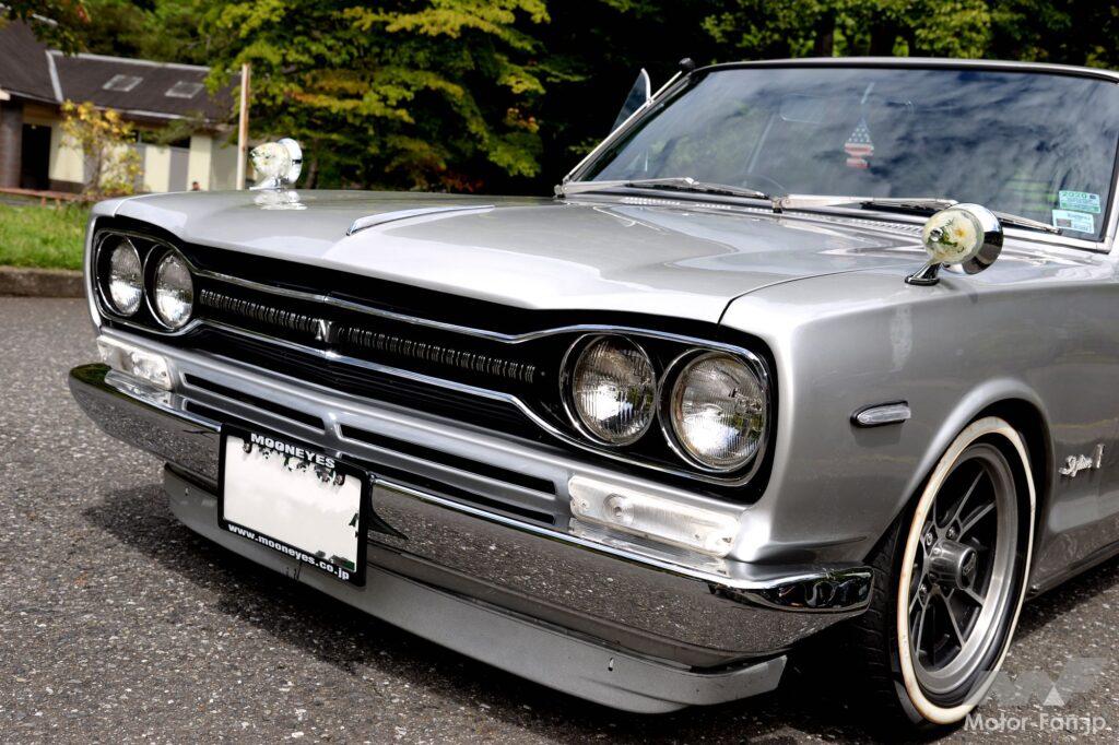 ただし、購入時に「ノーマルで乗ってほしい」と店主から告げられた。というのも、これだけ程度がよくオリジナル状態をキープしたスカイラインは珍しいため、派手な改造や元に戻せないようなカスタムをして欲しくなかったからだ。三ツ森さんも心得たもので、いつでも元に戻せる程度にしかカスタムしない。それがこのスカイラインの放つオーラになっているようだ。変更したのは車高調サスペンションによりローダウンしてアルミホイールを履いたほか、後期モデルのフロントグリルとテールランプを中期モデル用と入れ替えたくらい。フロントフェンダーのクリアウインカーが510ブルーバード用だったり、エアダム風のフロントリップスポイラーなどはいつでも脱着可能。貴重なボディだからサーフィンラインをカットすることなど考えもしなかったそうだ。