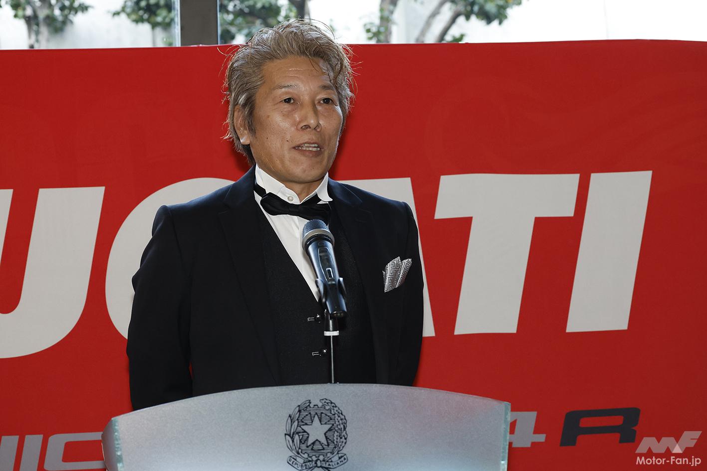 「イタリア大使館で体制発表会を行えたことを誇りに思います。イタリアを始め、ヨーロッパでのモータースポーツの認知度の高さは、現役のころに肌で感じていましたし、日本でもモータースポーツの地位が上がる一つのきっかけになればうれしいですね。33年間スズキでレースをしてきましたが、MotoGPから撤退した際にスズキのレース部門が解散したことがボクにとって大きな出来事でした。とにかく勝ちたい! という思いを実現するためにはドゥカティしかない!! とSBK時代から交流のあるパオロ・チャバティに相談したところファクトリーマシンを出してくれると言うから自分の耳を疑いました。そして参戦の目処がついたところで水野にオファーを出し今日に至っています。日本の4メーカーと真っ向勝負します! ぜひレースを見に来てください」と加賀山。