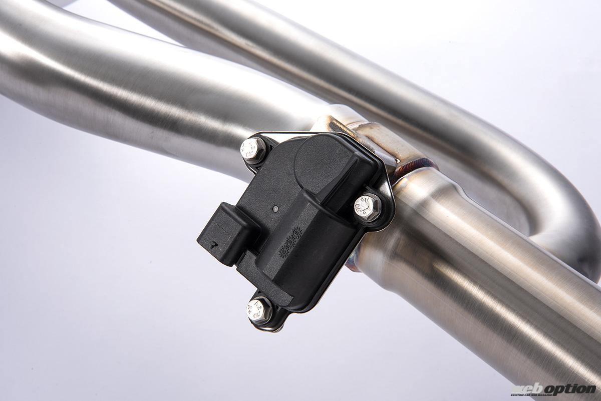 メインパイプの途中に取り付けられた“可変バルブ”と“消音用のバイパス経路”も、この製品の大きなトピック。メインパイプにはフルストレート用と消音用の経路がそれぞれ用意されており、可変バルブの開閉によってどちらの経路に排気を流すかをコントロールする。