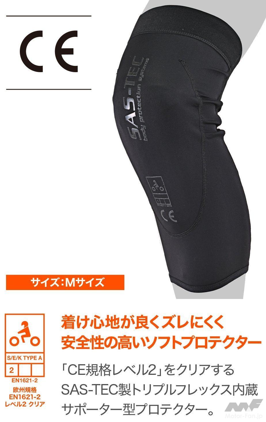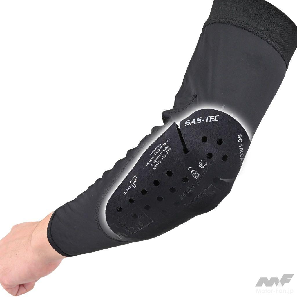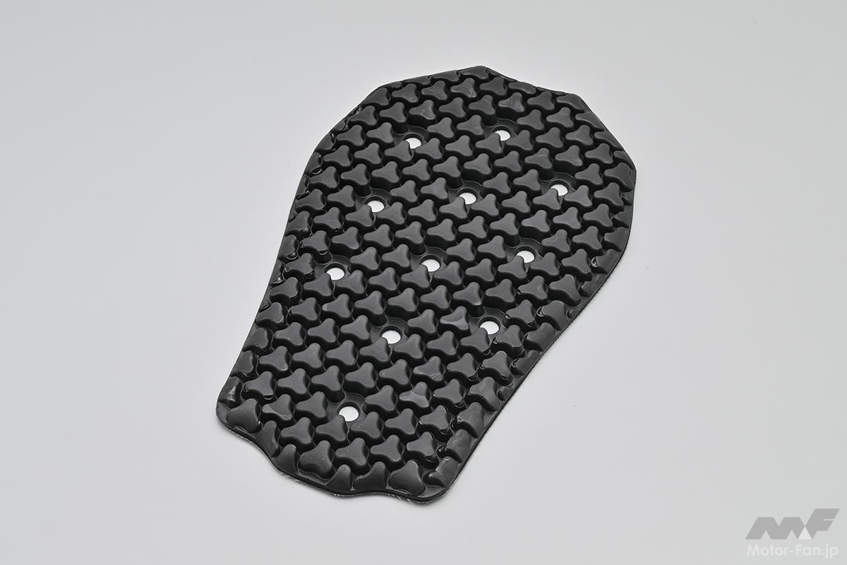 安全性に優れた「CE規格レベル2」をクリアする、SAS-TEC製のトリプルフレックスの背中用プロテクター。通常は柔らかく、体への追従性が高くて装着感も快適。一方、衝撃が加わると瞬間硬化する特殊な発泡ウレタンが、しっかりと体をガード。SAS-TEC製トリプルフレックスは通気性が良く、蒸れにくいのも特長。形状が合えば様々なウエアに使用可能。