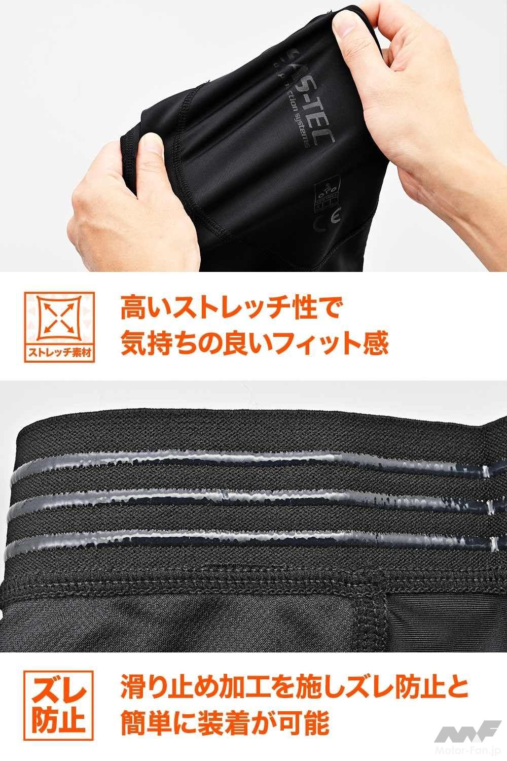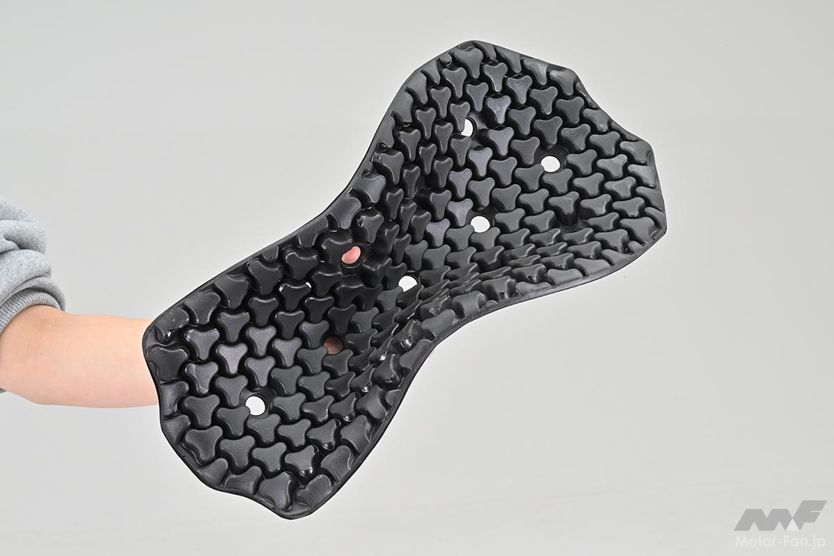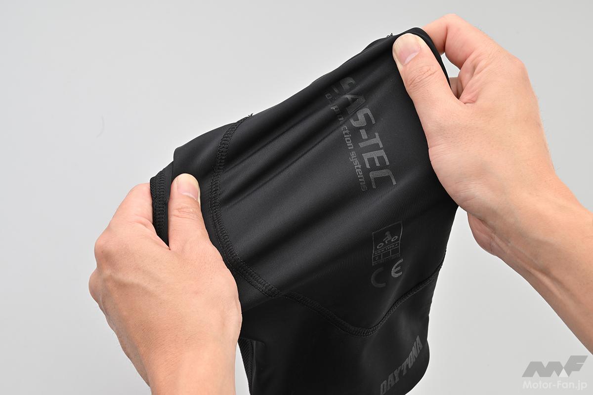 安全性に優れた「CE規格レベル2」をクリアする、SAS-TEC製のトリプルフレックスの背中用プロテクター。通常は柔らかく、体への追従性が高くて装着感も快適。一方、衝撃が加わると瞬間硬化する特殊な発泡ウレタンが、しっかりと体をガード。SAS-TEC製トリプルフレックスは通気性が良く、蒸れにくいのも特長。形状が合えば様々なウエアに使用可能。