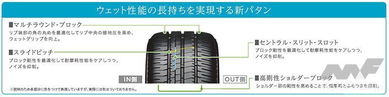 さらに、「ECOPIA NH200」は、新パタンにより走行中のノイズを抑制し、車内での静粛性も向上している。「ECOPIA NH200 C」では、ブロック剛性を最適化した新パタンにより、耐偏摩耗性とウェット性能とともにライフ性能の向上も実現。低燃費性能や摩耗ライフなどタイヤ性能の向上に加えて、コモナリティ・モジュラリティ※3技術により開発・製造工程の効率化を含めてバリューチェーン全体で環境負荷を低減するなど、社会価値・顧客価値の両立を図っている。