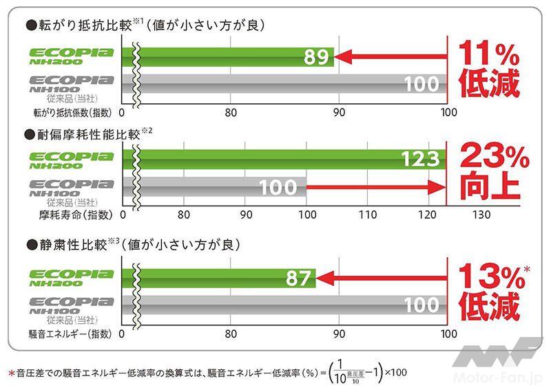 ※3 [テスト条件] タイヤサイズ:ECOPIA NH200 195/65R15 91H、 ECOPIA NH100 195/65R15 91H/空気圧:フロント250kPa・リア240kPa/速度:60km/h/試験車両:トヨタ プリウス DAA-ZVW50 1790cc 2016年式 前輪駆動/