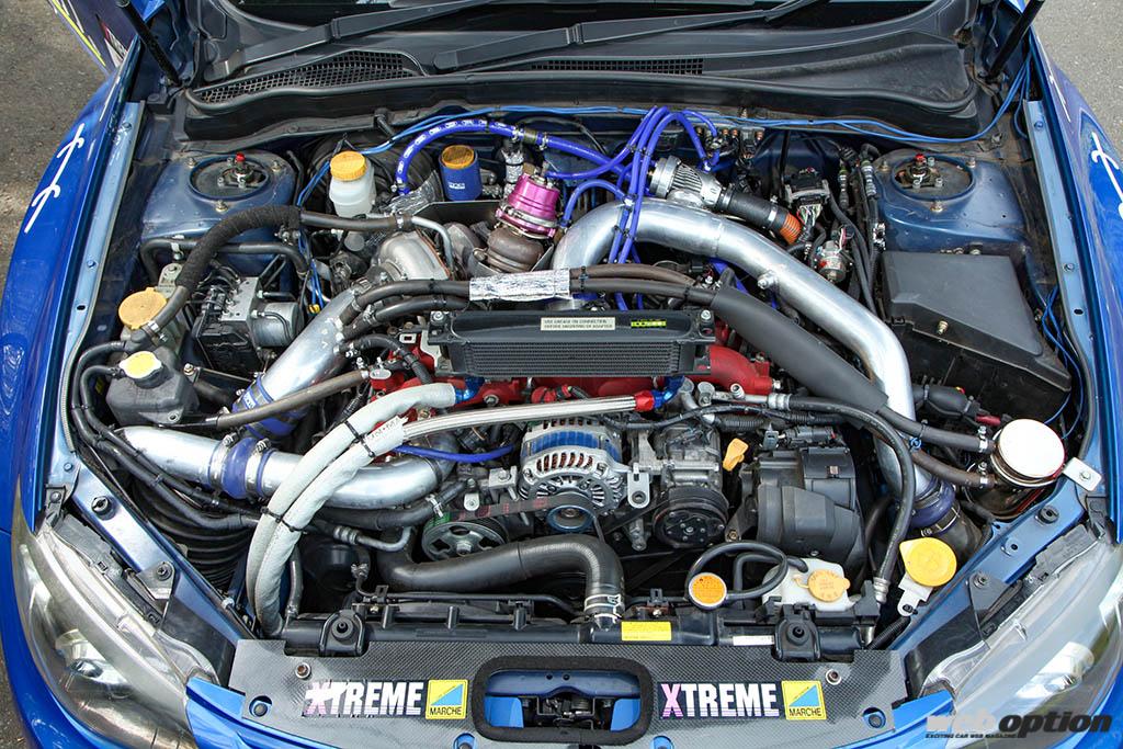 マルシェの実験マシンでもあるこのGRBは、先の目的を実現するためにあえてEJ20(EJ207)をベースとし、オリジナルのシリンダースリーブを使った2.5L仕様を搭載。かつて、EJ20用としてキット販売していたGT3037Sタービンを合わせる。