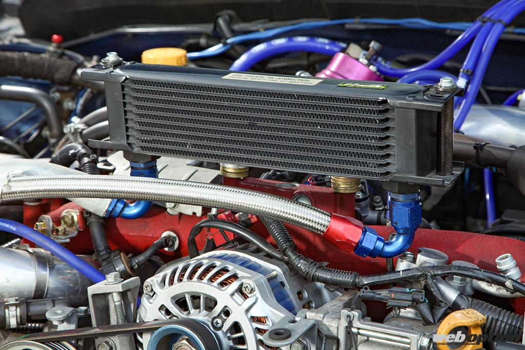 インタークーラーをフロント側に移設しているため、空いた純正インタークーラー位置にオイルクーラーをマウント。純正ボンネットダクトから取り込まれる走行風でエンジンオイルを効率的に冷却するわけだ。