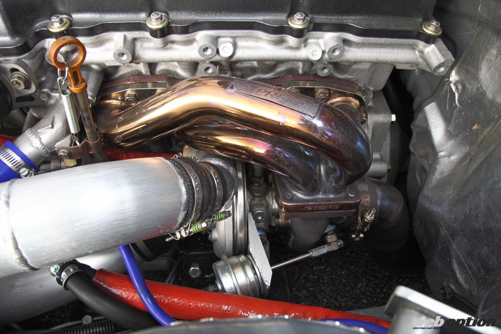 エンジンは、HKSの2.2Lキットをスリーブ入りブロックで組み上げ、純正形状(ポン付け)EXマニに装着できるボルグワーナーのEFR6758タービンをセット。このタービンはセンターカートリッジがアルミ製で軽量、またハウジングに組み込まれたブローオフバルブや軽量なガンマチタンのブレードの効果も高く、ブースト圧の立ち上がりが非常に良いそうだ。ちなみに、コンパクトなタービンながら489ps/61.7kgmを実測するほどの風量を持っている。