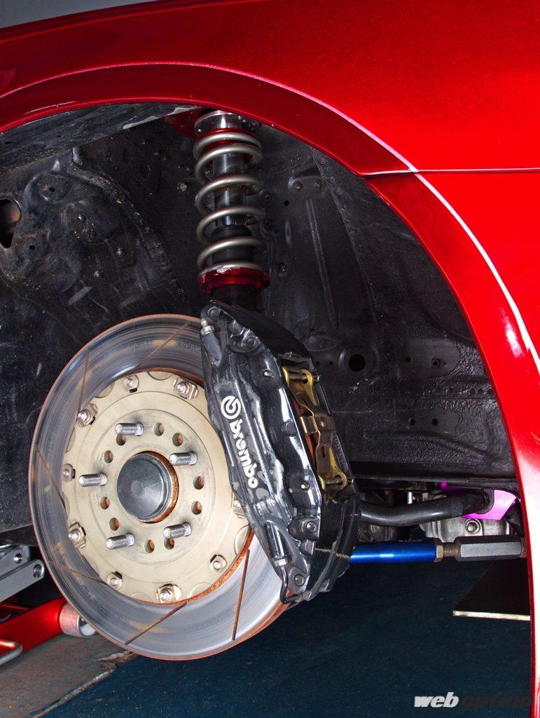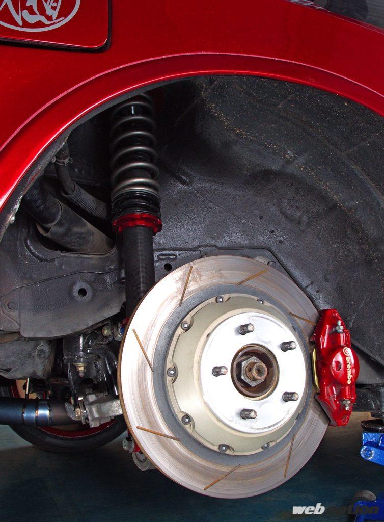サスペンションには、アームズの車高調をセット。その理由は…と中川メカに尋ねたところ、サーキットで一緒になった時に、その走りを見て「この足はイケる」と感じたからだという。アーム類によるジオメトリーの調整やスタビによるロール剛性の強化もしているが、ベースとなる車高調の性能は大きなウエイトを占めているのは言うまでもない。
