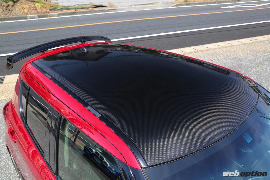 純正ルーフの上に被せるカーボンルーフシェル(7万2600円)。フィッティングも抜群な上にカーボン目も美しい。両面テープとシリコンボンドで固定する。純正穴を利用して装着するカーボンウイング(9万4600円)は2段階の角度調整式となる。