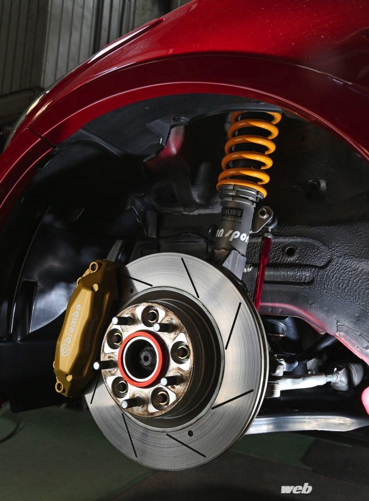撮影車両が装着していたのはDFVバルブを搭載したオーリンズ車高調をベースに、減衰力特性などを見直したラ・アンスポーツのオリジナルバージョン(27万9840円)。また、高い制動力を実現するブレンボキャリパーキット(要問い合わせ)も用意。こちらはスリットローターやブレーキライン、専用パッドも同梱する。