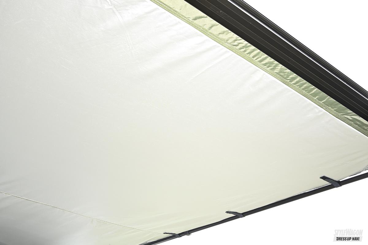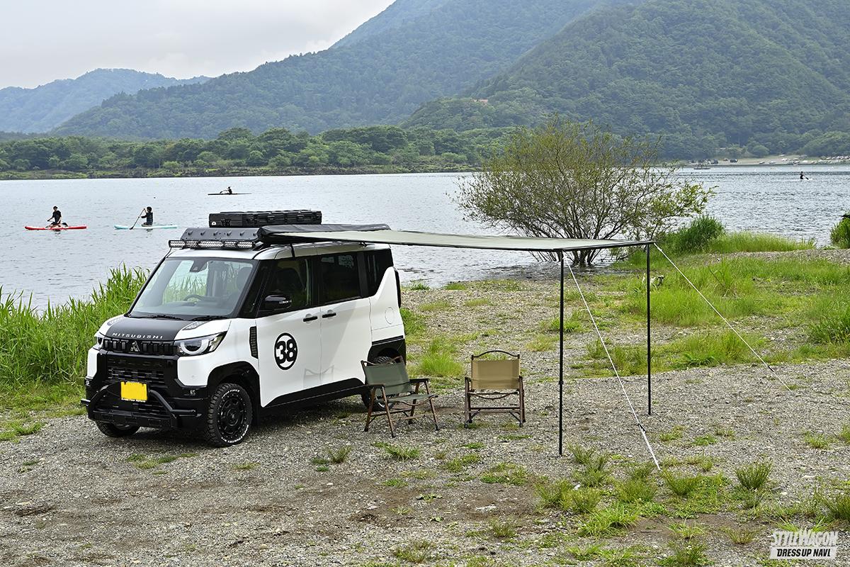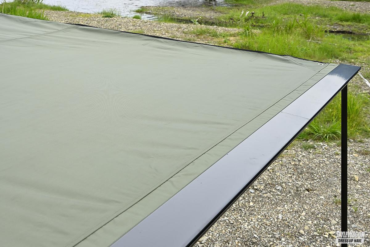 白いデリカミニに装着されるのが「バスターズ カーサイドタープEX」。最大の特徴が2×3mの大きなひさし。他メーカーでは長さ2m〜2.5mが主流となるので、この3mのひさしは大きな武器! フレームはブラックアルマイト、オーリブグリーンのシートは裏側アルミ蒸着加工で遮光性が高い。