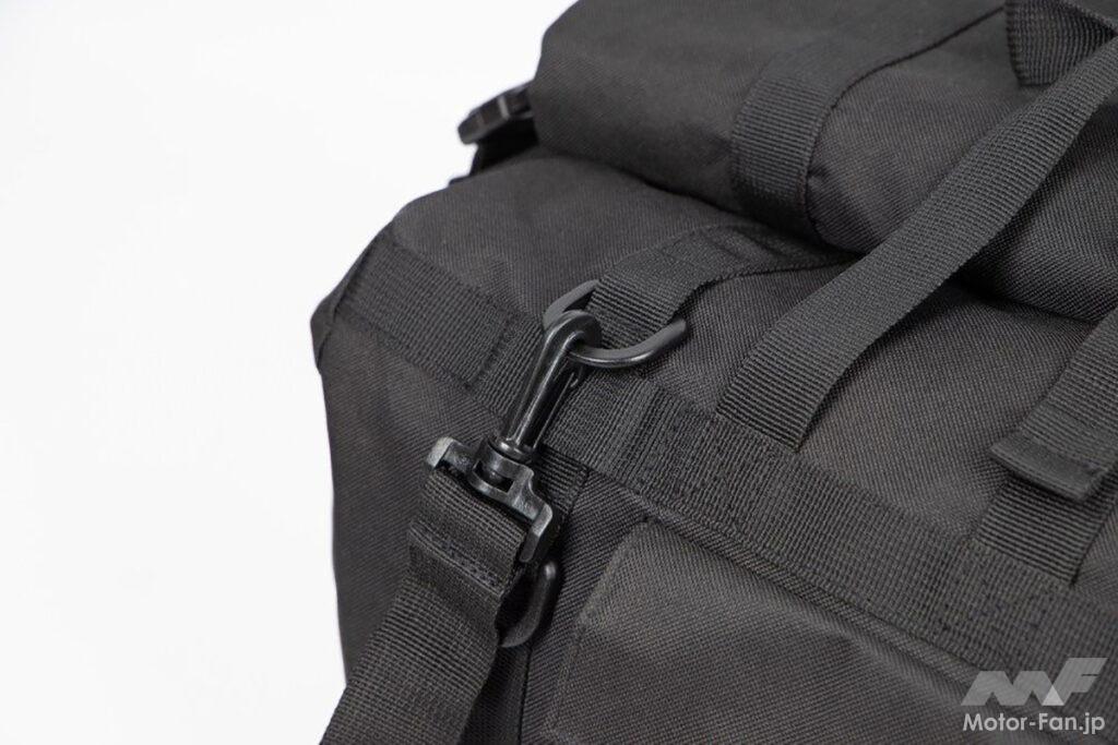 大きく開く開口部は中身が見やすく、バイクに搭載したままでも中の荷物をスムーズに取り出せるのがポイント。開口部には面ファスナーを採用しており、雨の侵入をガード。開口部をクルクルと丸めることができる「ロールトップ式」や、ワンタッチで開け閉めOKな「バックル」も導入済みだ。