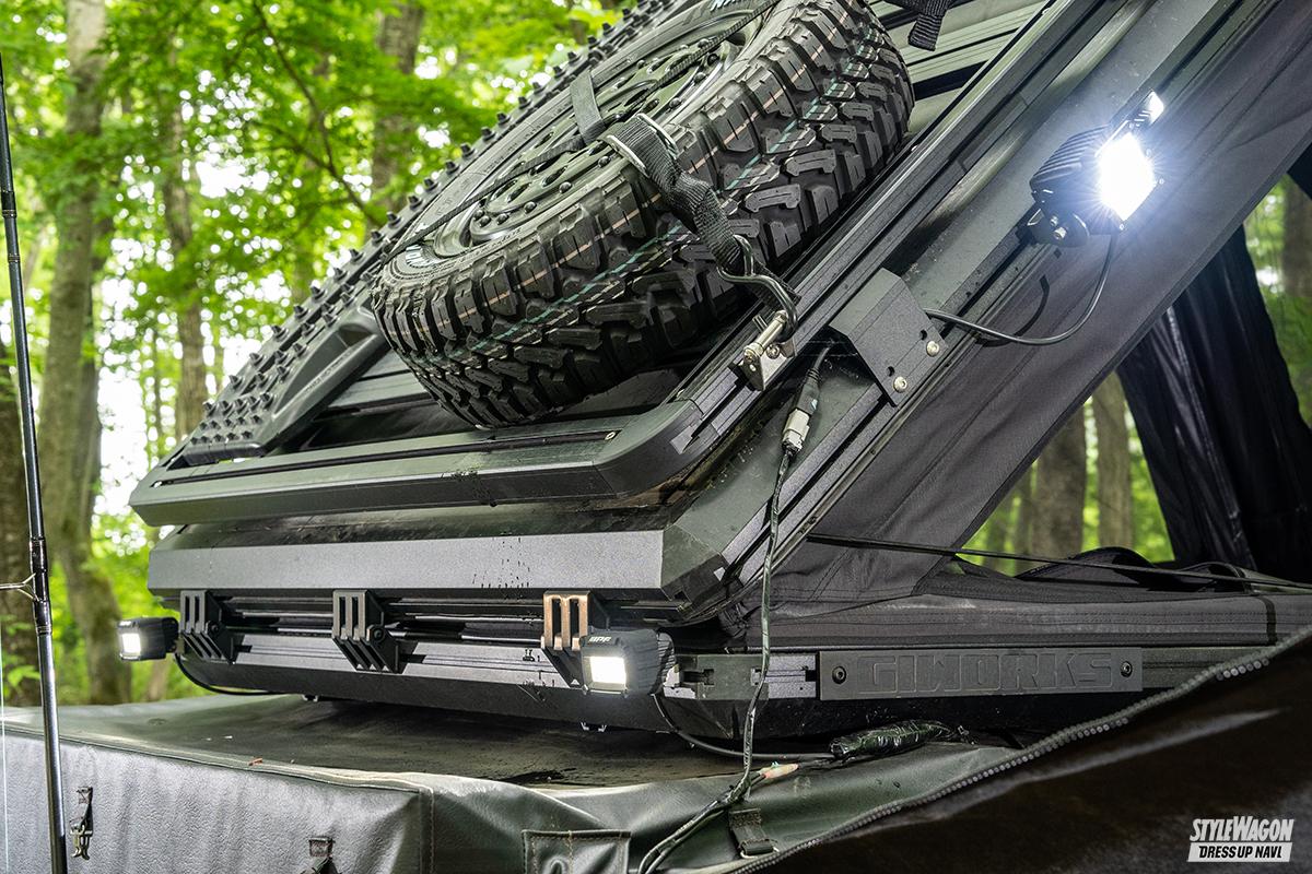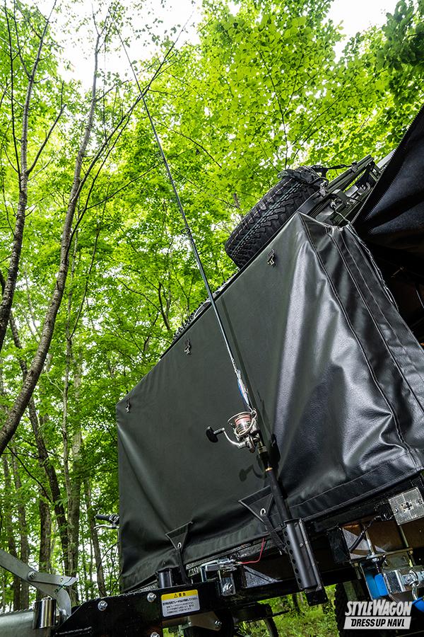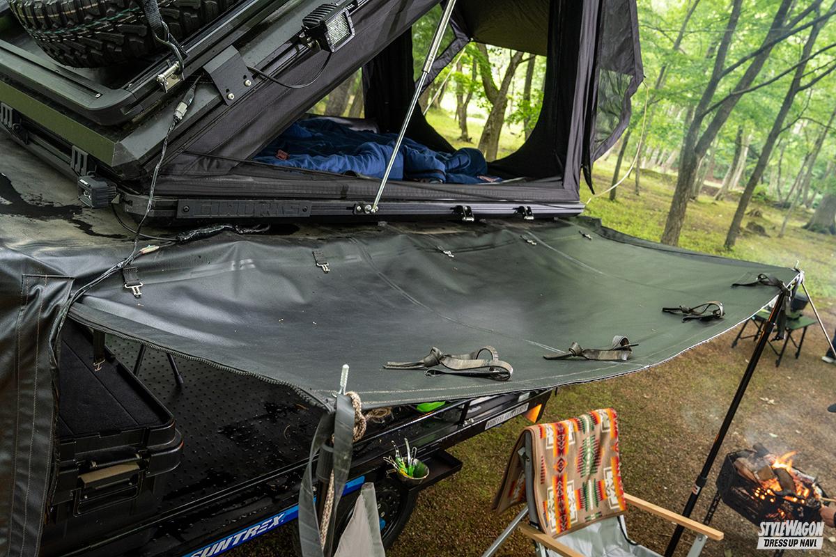 走行時はヤグラを包み込むカバーは巻き上げるだけでなく、左右と後方に広げることでタープとしても利用可能。とにかく徹底して機能性を突き詰めており、遊びゴコロを刺激してくれること間違いなし。今秋発売予定まで、待ちきれません!!