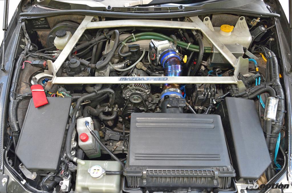 「ベース車は平成24年式の最終型RS。後期型は重たいので、運動性能のアップに軽量化が有効なんです。オリジナルフェンダーは左右で3kg、カーボンルーフは6kgほど純正より軽くなっています。このマシンはパワーを補うために、以前はNOSも搭載していました」というのは、松川代表だ。