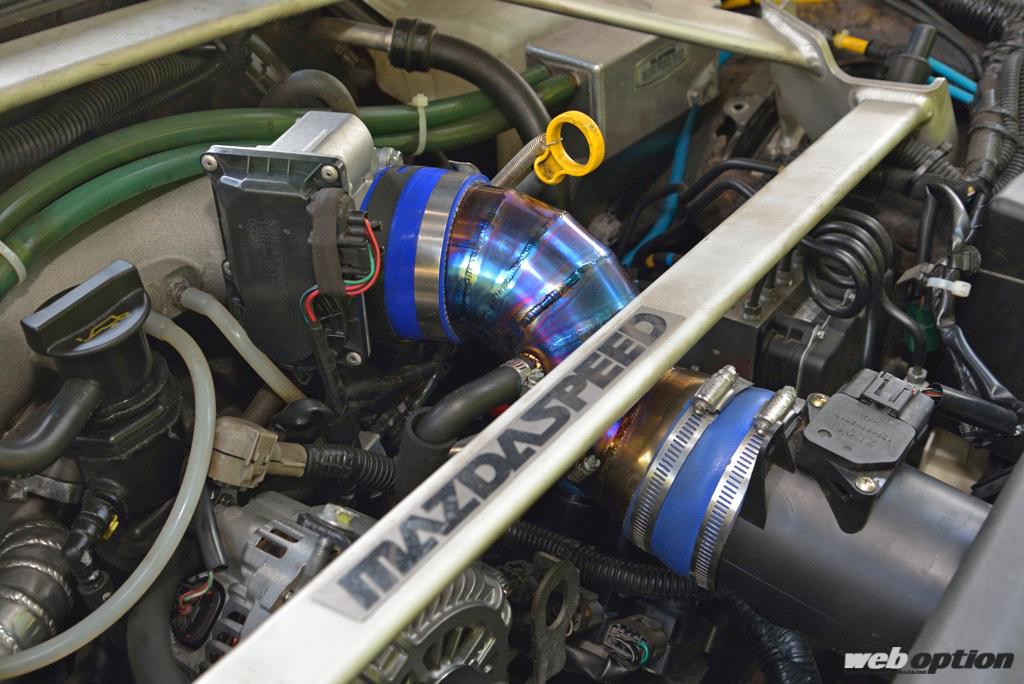 13B-MSPエンジンは、オリジナルサイドポート拡大仕様。チタンの輝きが美しいサクションパイプは80φ→90φの口径設定となっている。ファムスピード製のサージタンクは、インマニとオグジュアリーポートへのパイプを製作して装着している。エンジン制御はF-CON Vプロによるものだ。