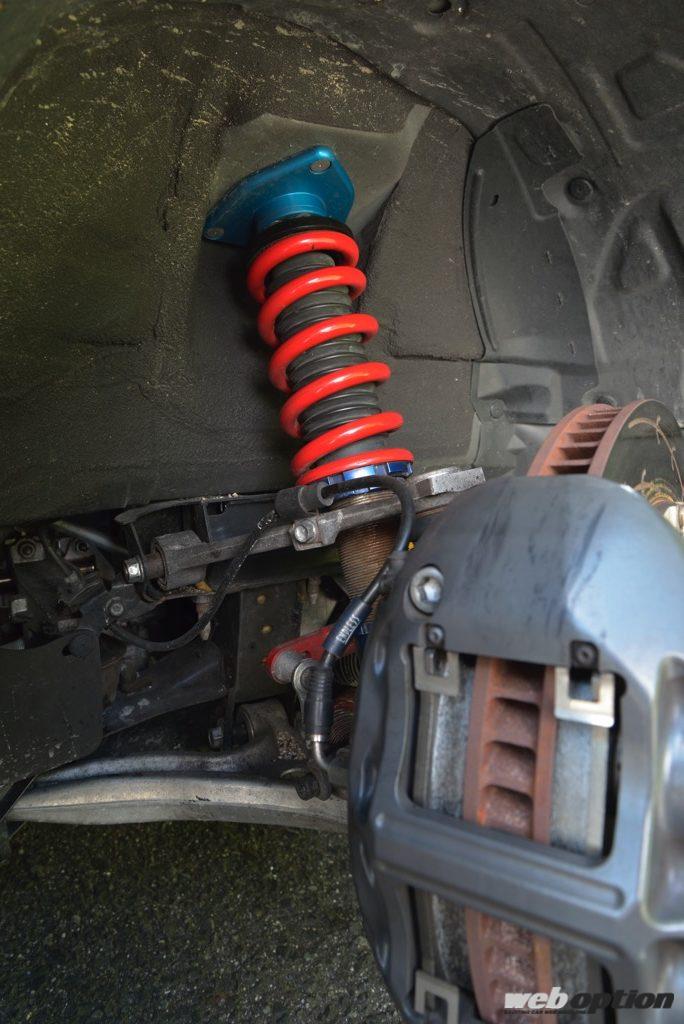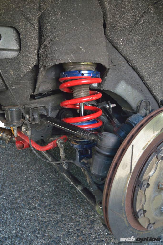 特徴的なのはリヤダンパーで、マルチリンク式としては珍しい倒立タイプを採用し、かなり長めのストローク量を確保している。またブッシュ類はソリッドな挙動を目指してフルピロ化。スプリングレートはフロント16kg/mm、リヤ12kg/mm。スペック的にはガチガチのサーキット専用車をイメージするかもしれないが、ストリートユーズにも十分に対応できる。