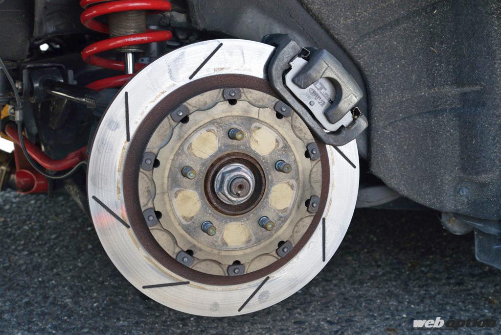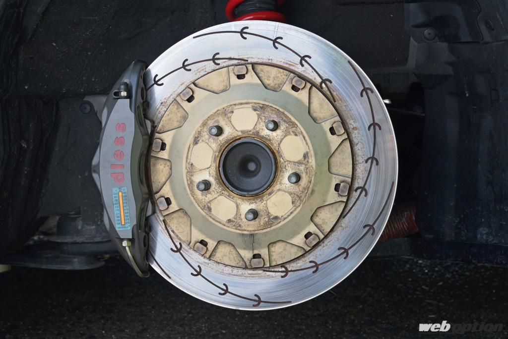 サーキット仕様らしく制動力の強化も抜かりなし。フロントはエンドレスのモノブロックキャリパーに大径2ピースローター、リヤはノーマルキャリパーでスリットタイプローターに変更している。パッドは前後IDI製を選択。