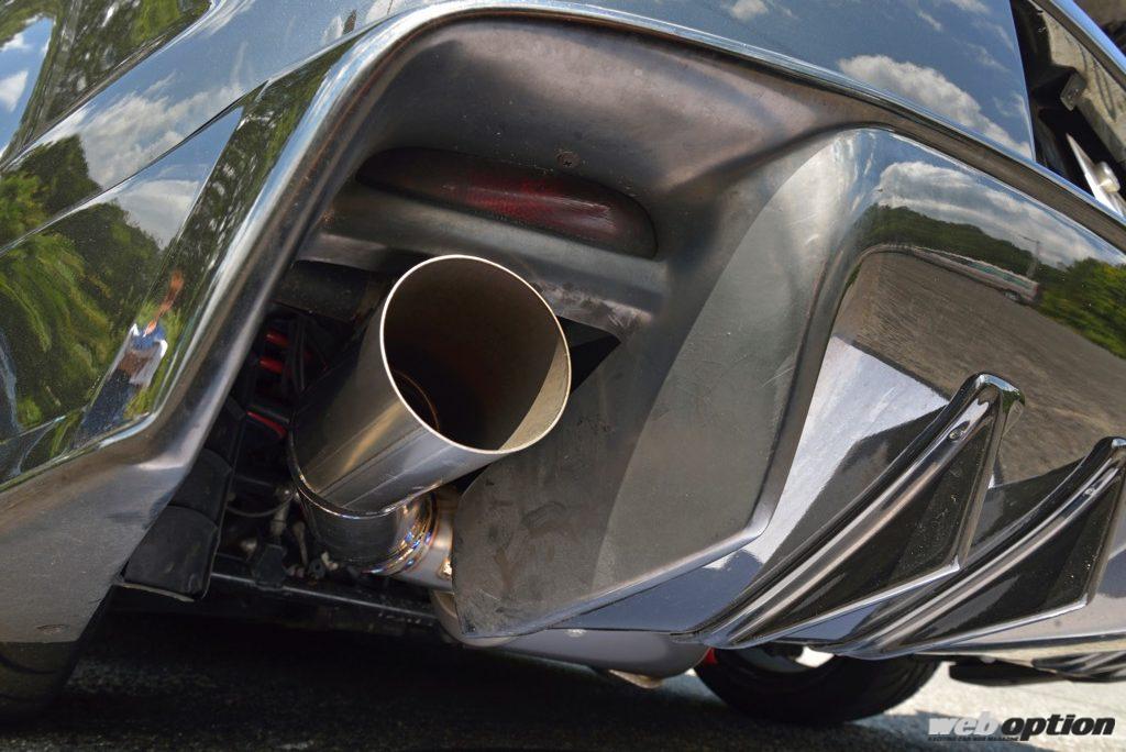 オリジナルフルチタンマフラーは、70φメインパイプに80φテールの組み合わせ。排気分岐部の抵抗を嫌って、左側からのシングル出しタイプとしている。シングル出しは軽量化面でも大きなメリットとなる。