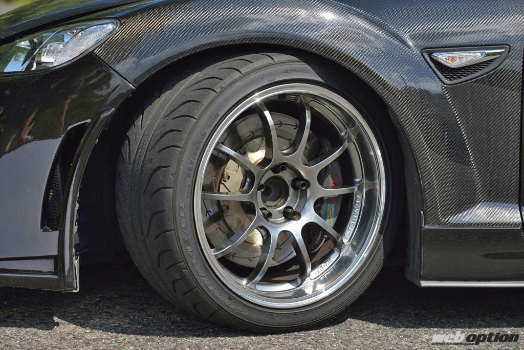 ホイールはアドバンレーシングブランドでは初となる鍛造モデルのRZ-DFで、サイズは前後とも10J×18+35。タイヤはグッドイヤーイーグルRS-Rの265サイズだ。