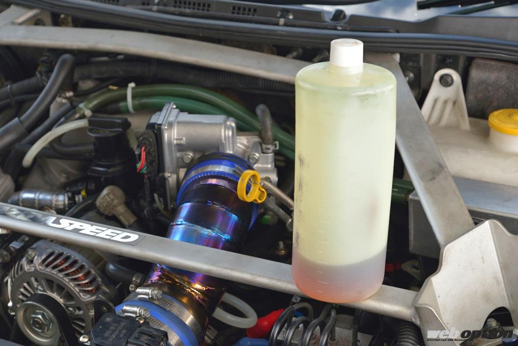サーキット走行など高負荷、高回転を常用するオーナーに、エンジンブロー防止の保険的な意味で勧めているのが、オリジナルのミクスチャーオイル。ガソリン満タン時に200cc注入する。