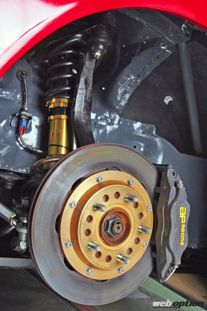 ブレーキはフロントにapレーシング4ポットキャリパー、リヤにEK9純正キャリパーを流用。ハブもEK9のものを移植して5穴化。車高調はGフォースオリジナルのサーキットスペックで、スプリングレートはフロント18kg/mm、リヤ16kg/mmというハードな設定だ。