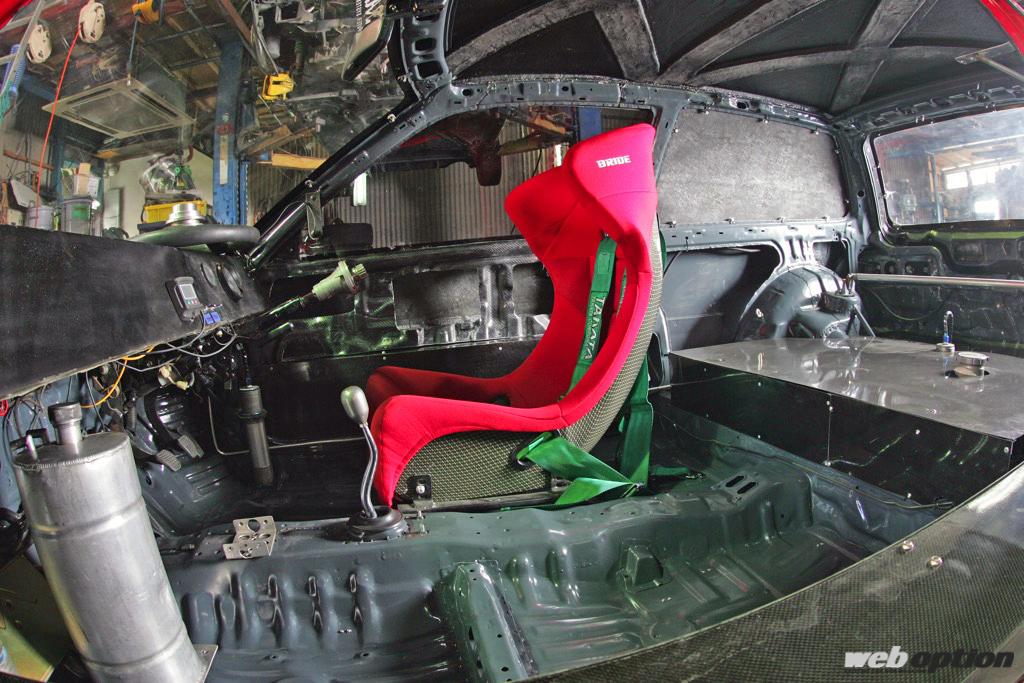 室内は完全にレーシング仕様だ。助手席側に見えるのはドライサンプ用のオイルタンク。なお、ルーフにバッテン形状に入っているリブには、蜂の巣状のハニカム材が使用されている。