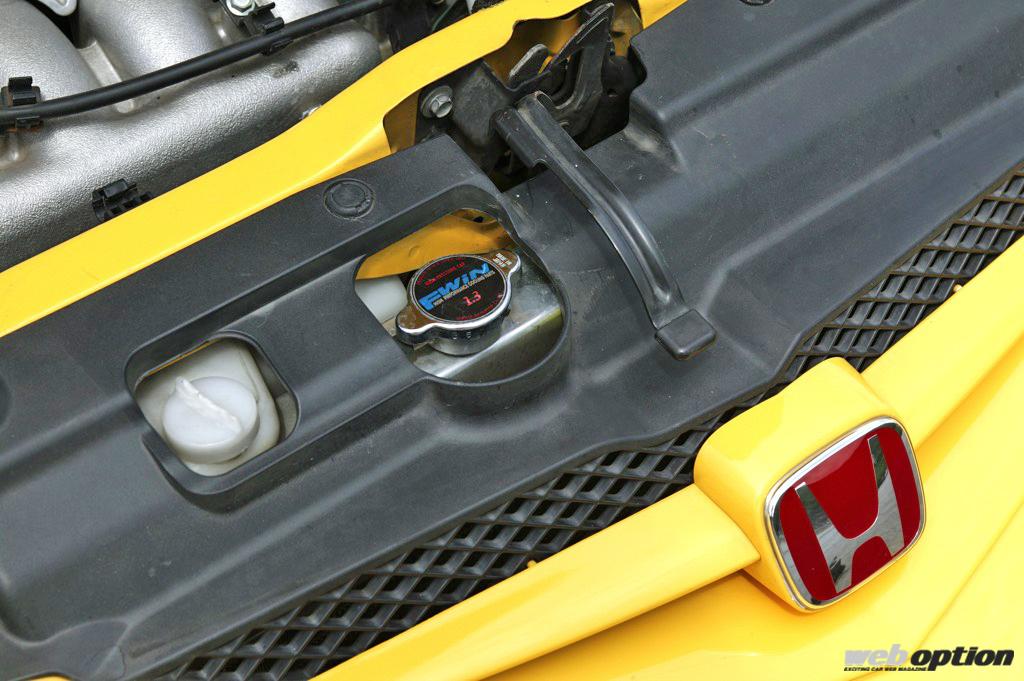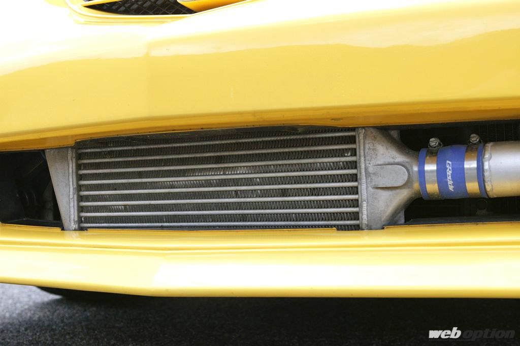 増大したパワーを安定発揮させるための冷却チューンも抜かりはない。ラジエターをアルミ2層タイプに変更し、オイルクーラーも追加。また、ターボ化によってエンジンルーム内に熱がこもりやすくなるため、ヒートエアを強制排出するべくダクト付きエアロボンネットも装着済みだ。