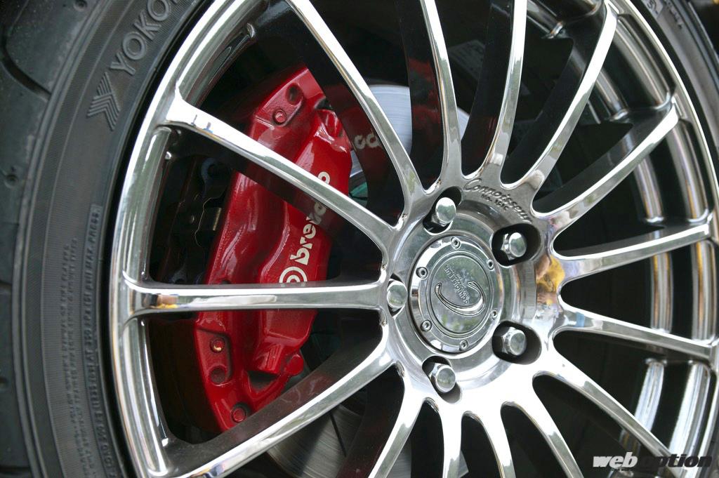 足回りはHKSのハイパーマックスダンパーでセッティング。ブレーキ系はパッドとローターを交換して余裕のある制動力を確保している。ホイールはヨコハマのコニサー、タイヤはアドバンネオバ(FR225/40-18)。LSDはATSのカーボン1.5WAYだ。