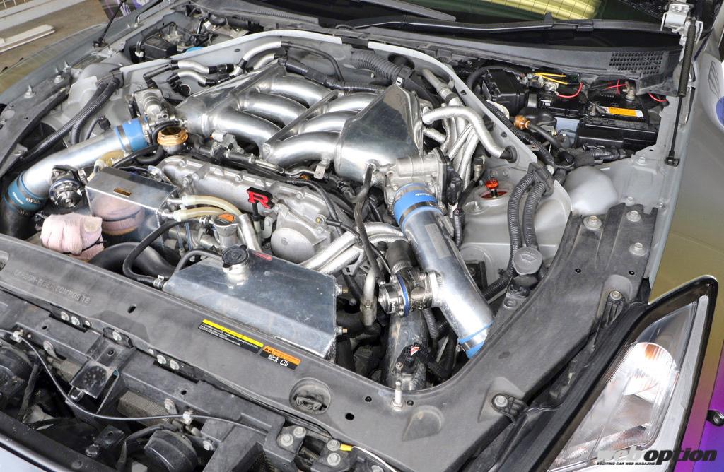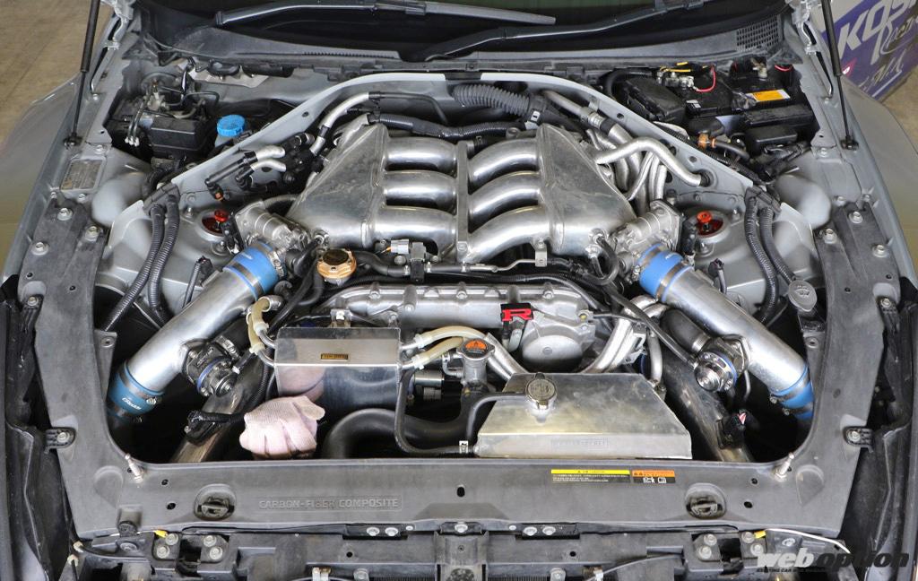 現在の仕様は「ノーマルエンジン&タービンでどこまでタイムを出せるか?」がコンセプト。そのためエンジン&タービンに手は加えられていないが、インジェクターはノーマルの570ccからHKS製の860ccに変更され、トップシークレット製のサージタンクやトラスト製インタークーラー、サクションパイプ、前期GT-Rの必需品とも言えるHKS強化アクチュエーターが装着され、現車セッティングが施されたガレージライズアップオリジナルECUで制御。ブースト1.45キロで635psという最高出力を絞り出している。