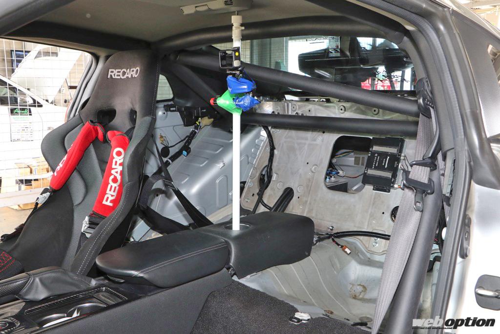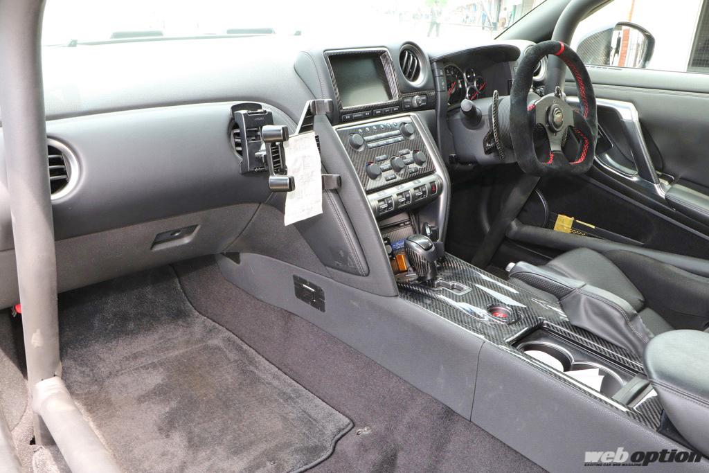 サイドバー入りの10点式ロールケージでボディ補強しながら、リヤシート等の不要なモノは撤去して軽量化。また、サーキット走行をするR35GT-Rにありがちなトラブルとして、燃料タンクがノーマルの場合、燃料が半分くらいになった段階でガス欠症状が出てしまうため、コレクタータンクの装着でこの問題をクリアしている。この辺りの問題対策も、数多くのGT-Rチューンを手がけているライズアップならではと言えるだろう。