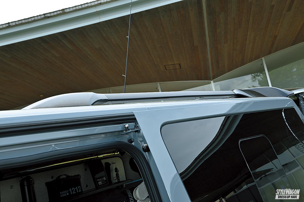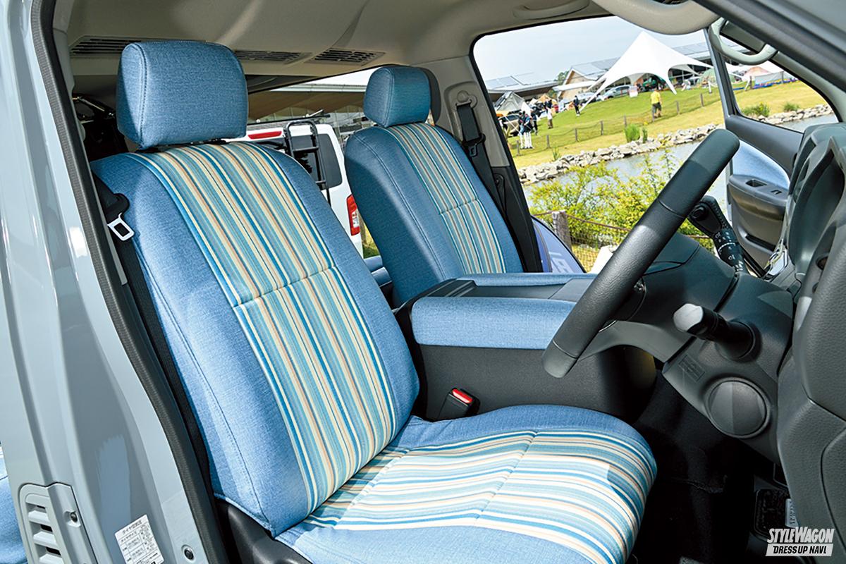 「ランガン」とはクルマに乗って移動しながら次々とポイントを変えていくフィッシングスタイル。そんなランガンのために開発されたキャラバンが、この〝ランガンギア〟だ。そのため、インテリアには釣りを楽しむための装備が満載。特に、機能性を大きく向上させているのがフリップベッドだ。休憩・仮眠をとるならベッドスタイルで、右側だけを跳ね上げれば仕掛けを作るベンチとして、両側を跳ね上げれば荷物を多く積めるなど、両側跳ね上げ式とすることでシーンに合わせたフレキシブルな使用方法を可能としている。なお、内装のデザインはポップで爽やかな印象に。シートとベッドの表皮は「80年代マリン仕様」をテーマにしたパステル調のカラーリングを採用している。車内には電子レンジや冷蔵庫なども備えており、使い勝手が良いのもポイント。釣り好きにはたまらないキャラバンだ。