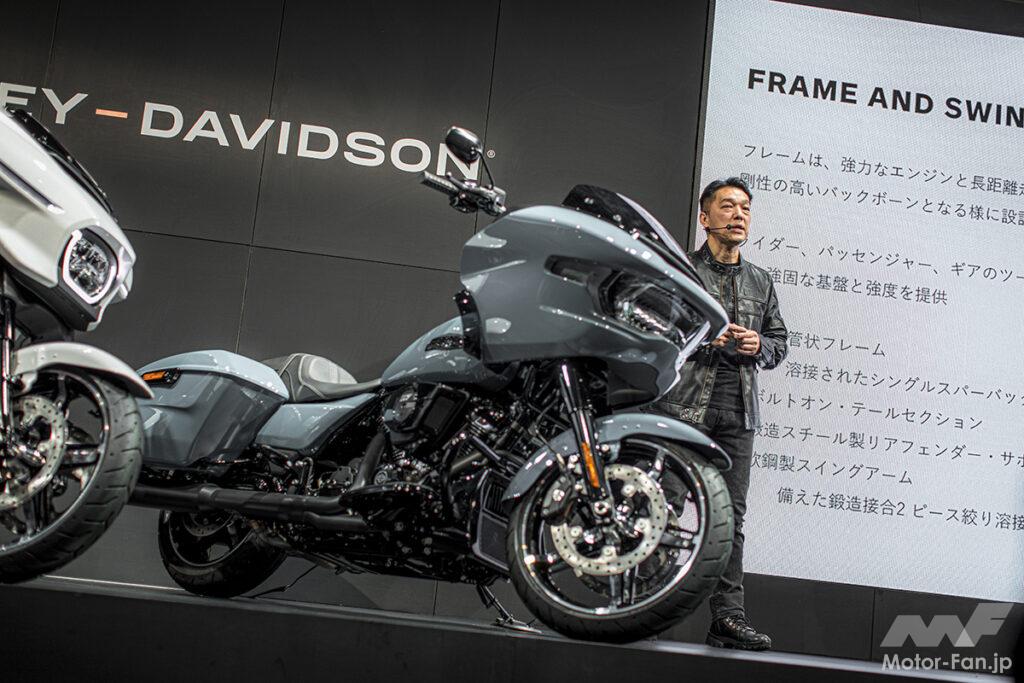 ハーレーの新時代を予感させる、流れるようなフォルムのフロントカウルを装備した「ROAD GLIDE®(ロードグライド)」。写真右はハーレーダビッドソンジャパン社長・野田一夫氏。