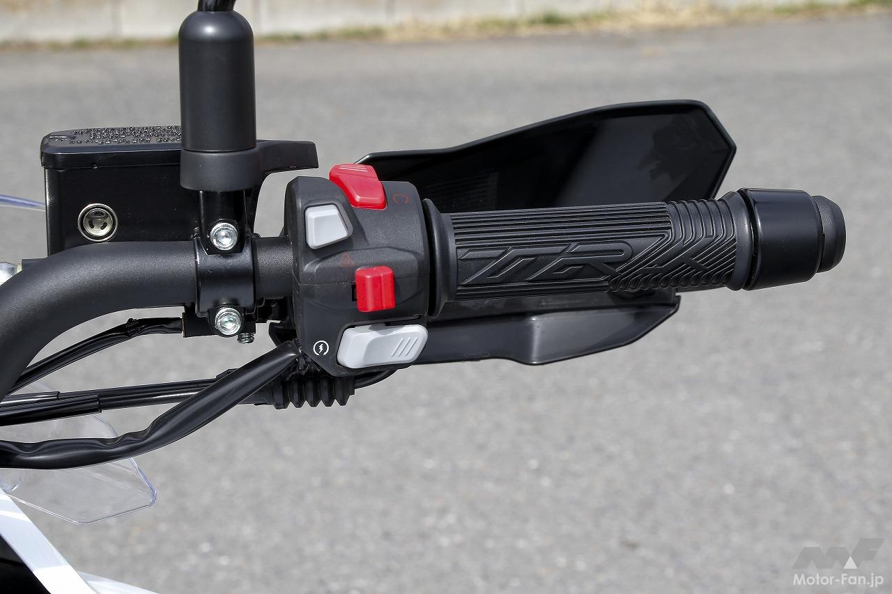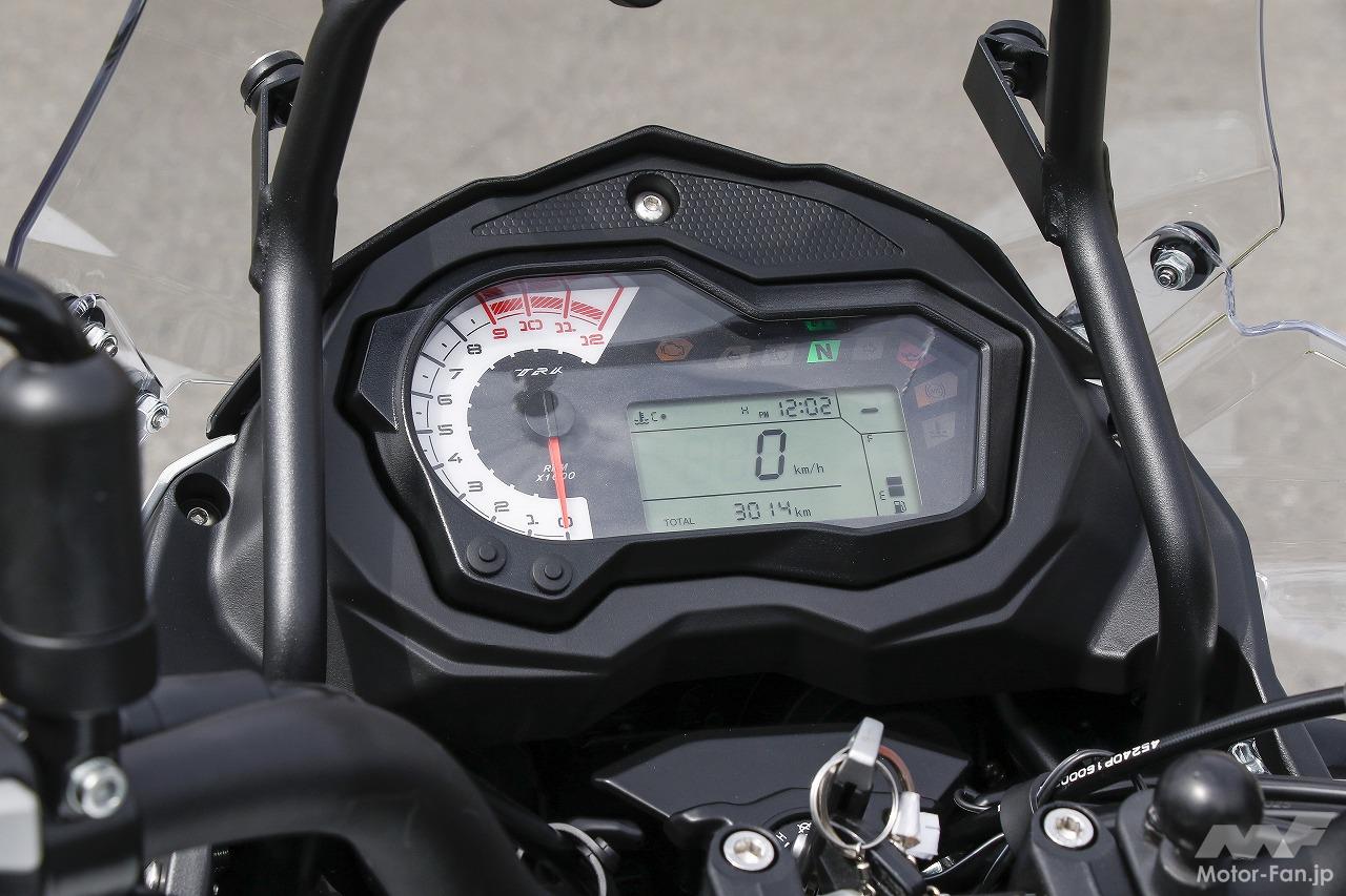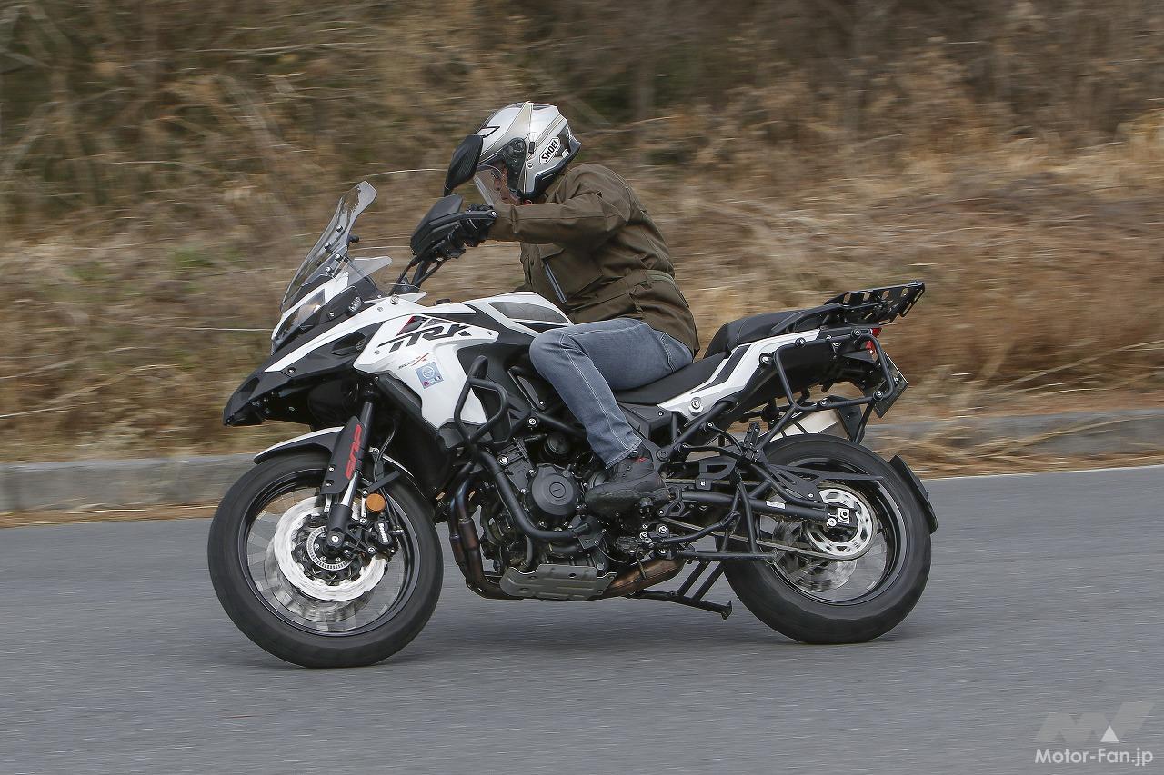 エンジンは500㏄水冷DOHC4バルブ並列2気筒で、イタリアのA2免許に対応したおよそ48psの最高出力となっています。排気量からするとやや控えめなスペックだし、車重も235㎏と重ためなのでパワー不足なんじゃないか、との思いを抱いてスタートさせました。たしかに強烈なトルク感はなく、360度クランク並列2気筒らしい躍動感も体感しません。ところがスムーズにレスポンスするエンジンは全回転域で使いやすく、低中回転でのトルク不足も感じません。 クラッチレバー、シフトペダル操作の軽さもあって、とにかく走りが優しいのです。個性のあるパワーフィーリングでエンジンの存在感を表現するバイクが多い中、TKR502Xは逆に、クセがなくだれにでも扱いやすいパワーフィーリングとすることで親しんでもらおうとしているように思えました。結果的に、ゴー&ストップを繰り返す市街地でもストレスを感じさせないし、郊外のツーリングでの快適性も非常に高いと思いました。もちろん気になるような振動もないので、アドベンチャーツアラーらしいロングツーリングに適したエンジンだと感じました。