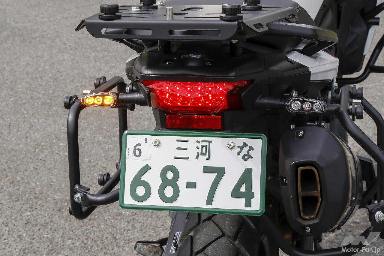 走行風を抑制してくれる大型ウインドスクリーン、飛び石や枝などのヒットから手を保護してくれるハンドガード、エンジンガードにアンダーガードとアドベンチャーツアラーに要求される装備はすべて揃っていて、アクセサリーとして用意されているアルミケース類を装着すれば、そのままロングツーリングに出ることが可能です。