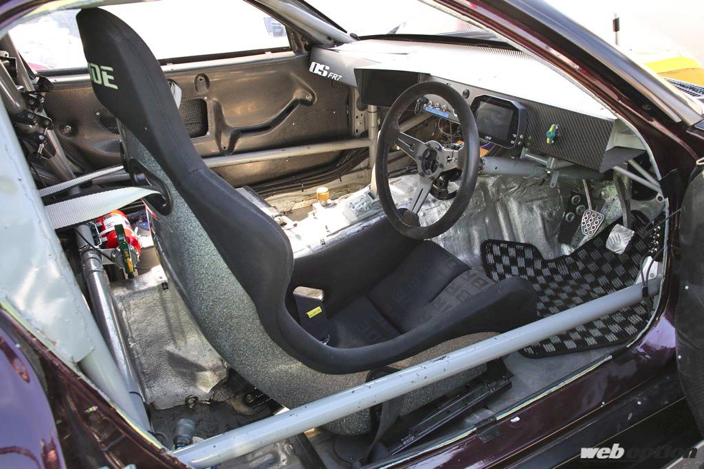 一方の室内は、完全なレーシング仕様だ。ボディパーツ同様にカーボン製ダッシュボードを投入するなどして車重を1040kgまでシェイプ。メーターはAIMのロガーで走行情報を取り込み解析を行う。