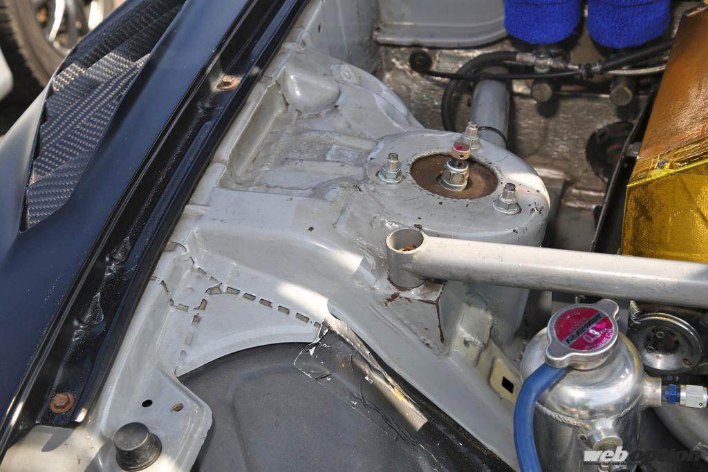 空力性能が高まったボディで、サスペンションを的確に動かすためには補強が重要だ。サスペンションの支点となるストラットタワーはもちろん、ボディ全体に追加スポットを打つなどして剛性を大幅に高めている。