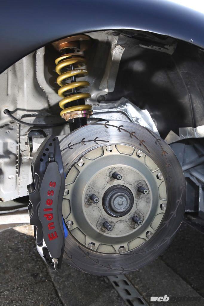 ブレーキは前後ともにエンドレスのモノブロックキャリパーシステムを導入。重量増を最小限に収められるだけでなくフィーリングも絶妙で、コーナリングを重視したNAマシンだからこそ拘ったポイントだ。