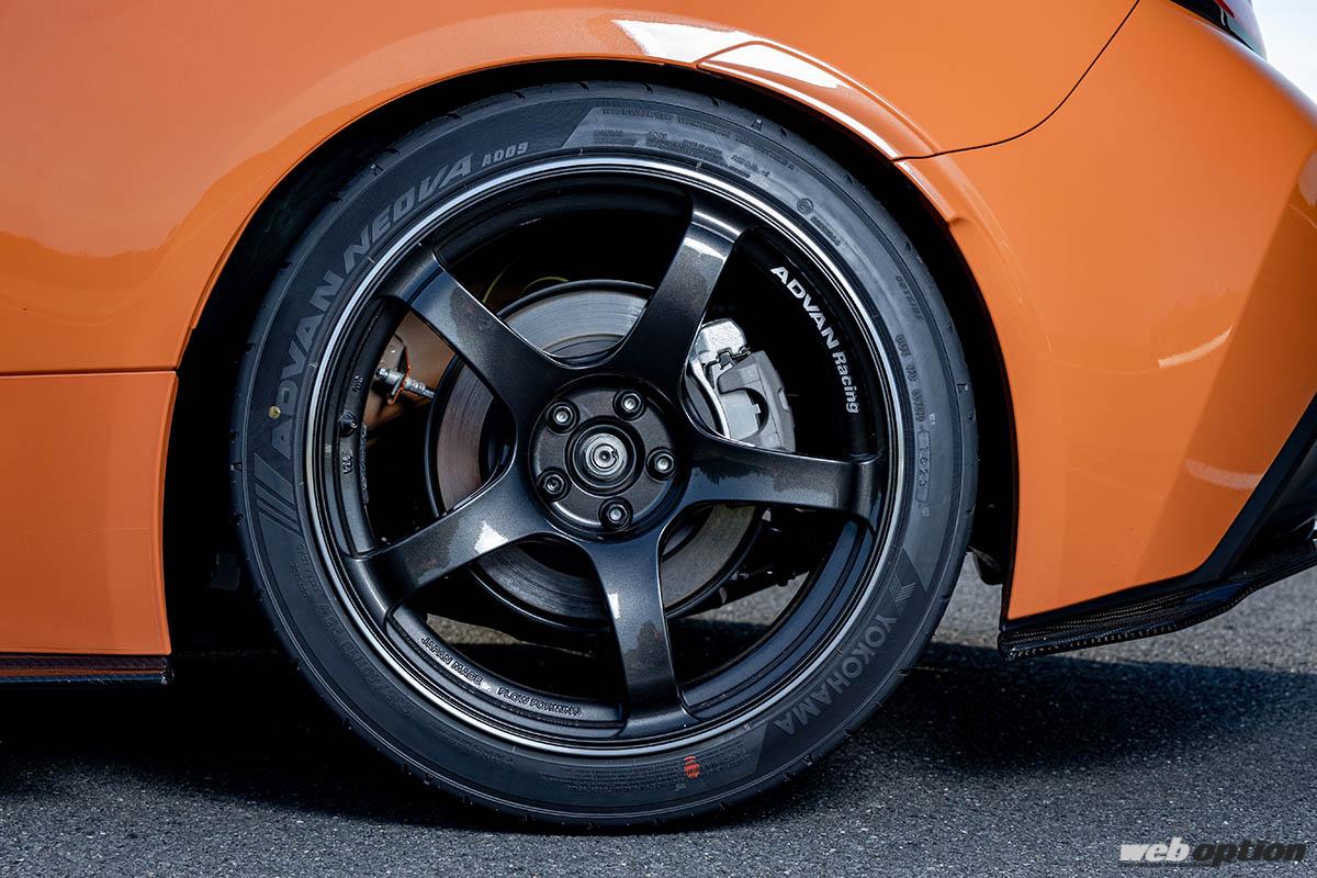 ホイールは、アドバンレーシングTC-4で、サイズは前後9.0Jプラス51をチョイス。タイヤも同様にアドバンブランドのネオバAD09で、サイズは235/40R18で統一している。