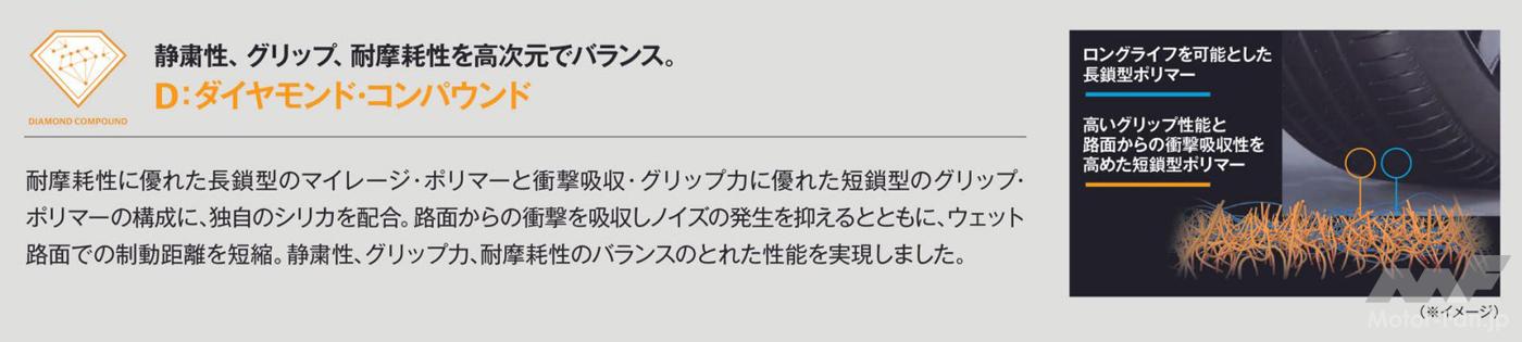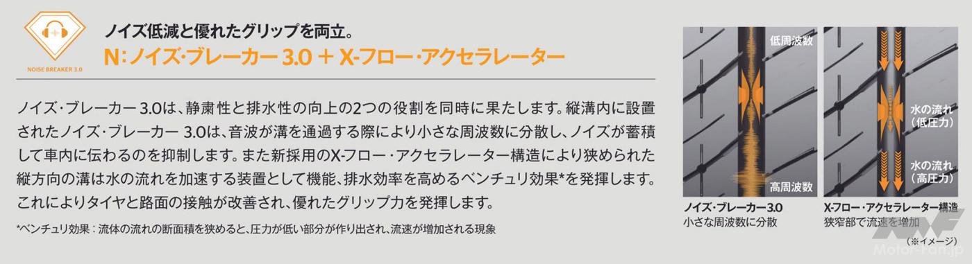 ノイズ・ブレーカー3.0が、縦溝内を通る音波を遮断し、分解・分散させることで、ノイズが蓄積して車内に伝わるのを抑制するだけでなく、新採用のX-フロー・アクセラレーター構造により狭められた縦方向の溝部分にベンチュリ効果(※)が発生することで、水の流れが加速して排水効果が高まり、優れたウエットグリップ力を発揮する。静粛性の高いタイヤはドライバーのストレスを低減し、より快適なドライビングをに寄与する。